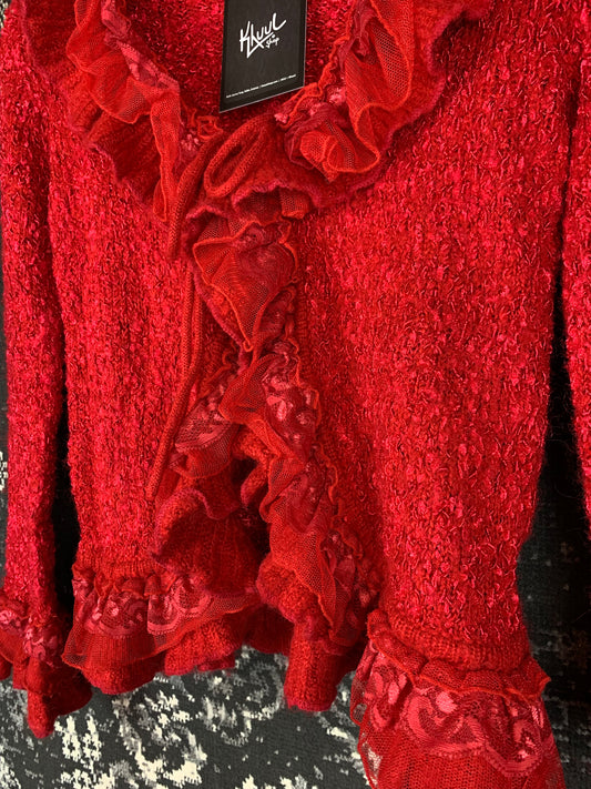 Romantic Vintage Red Knit Cardigan with Ruffle Trim