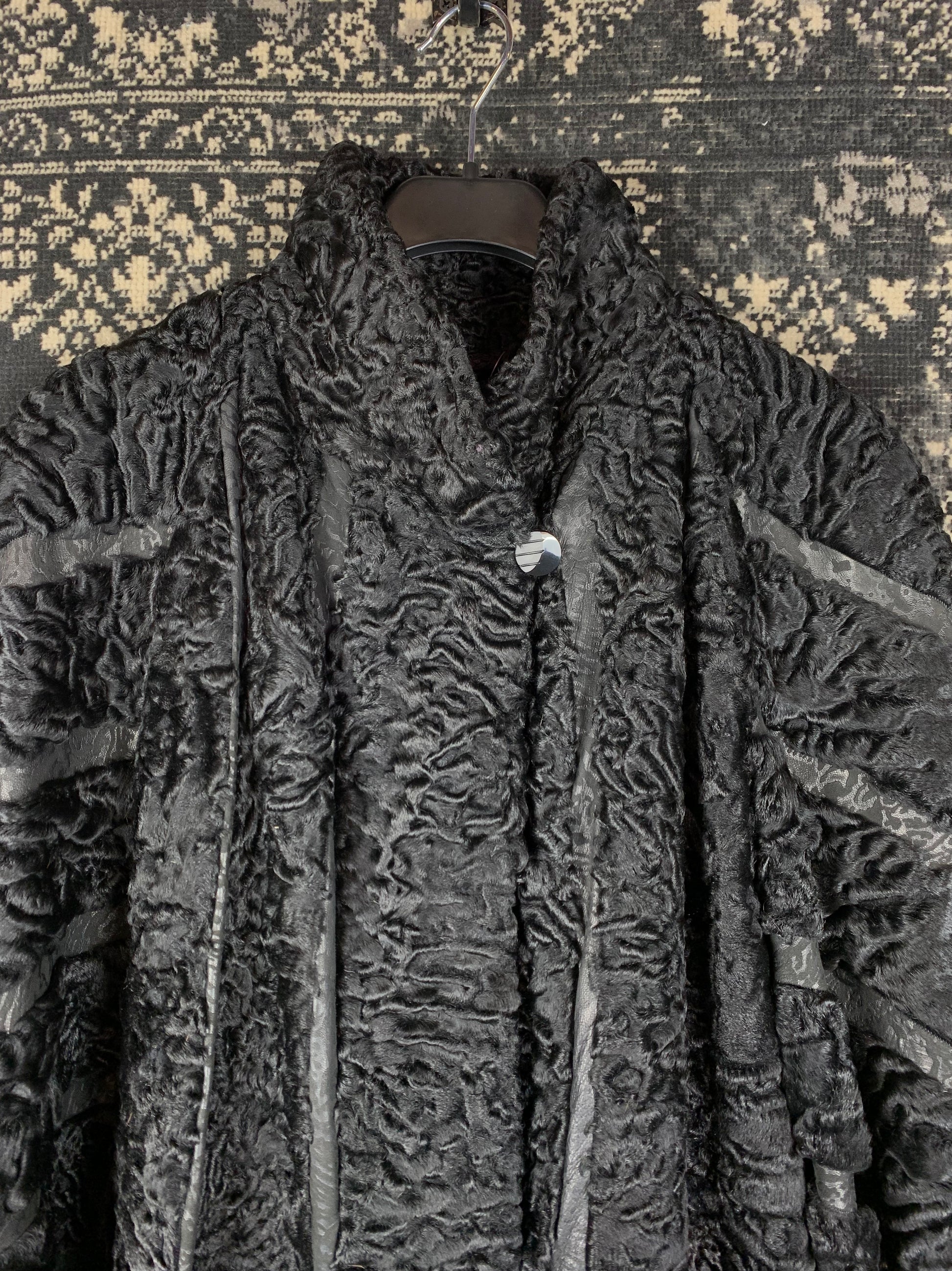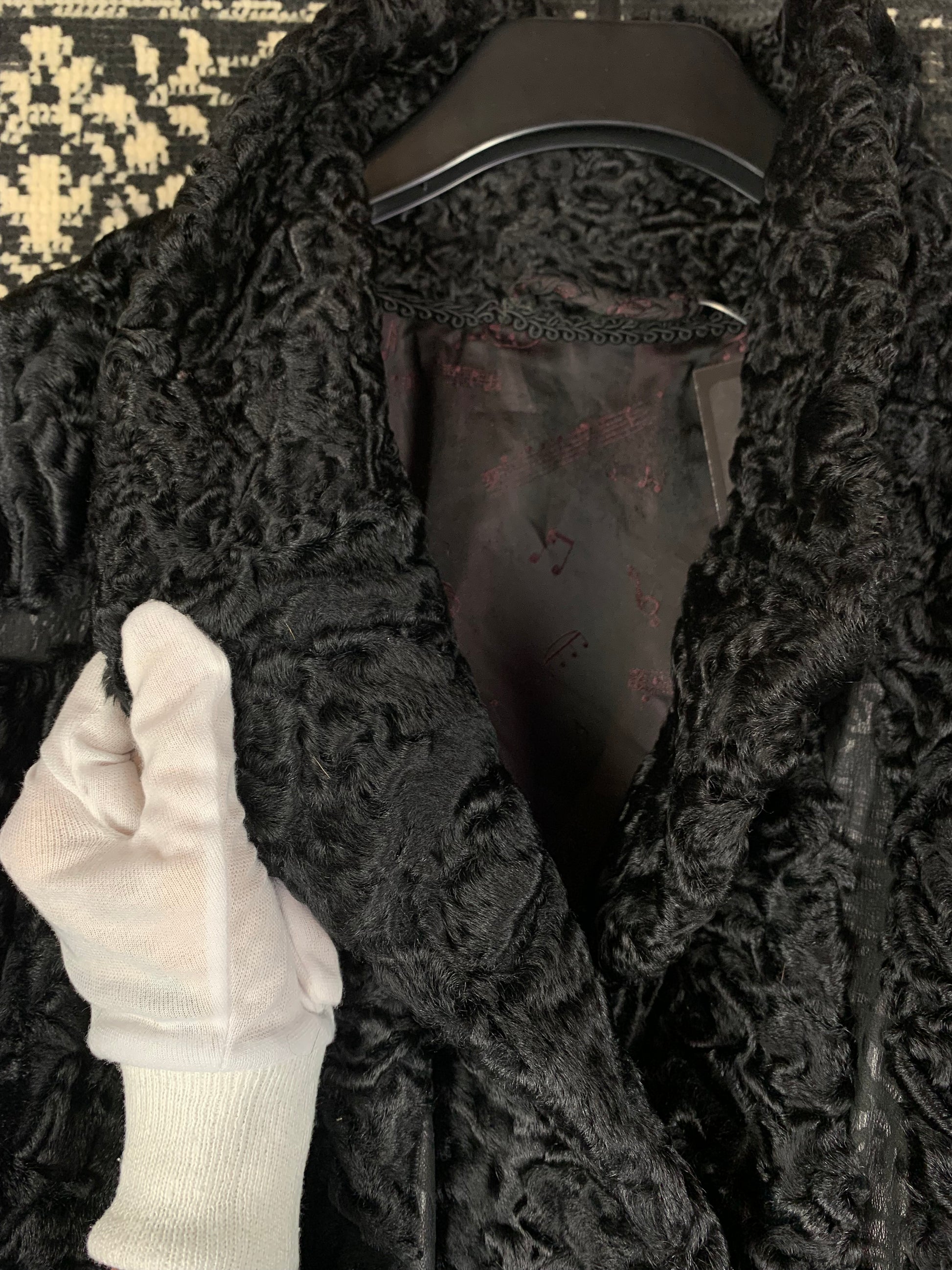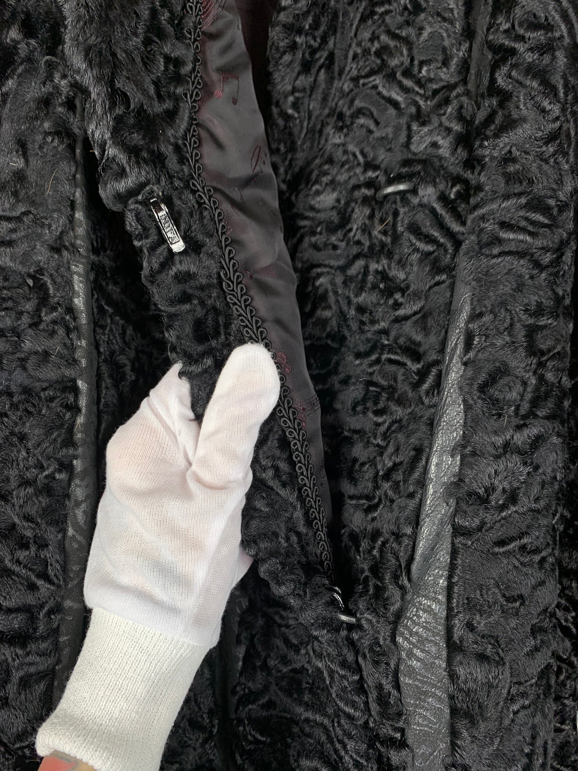 Women's Vintage Black Persian Lamb Fur Coat with Textured Pattern and Satin Lining – Elegant Curly Swirl Long Winter Outerwear – XXL