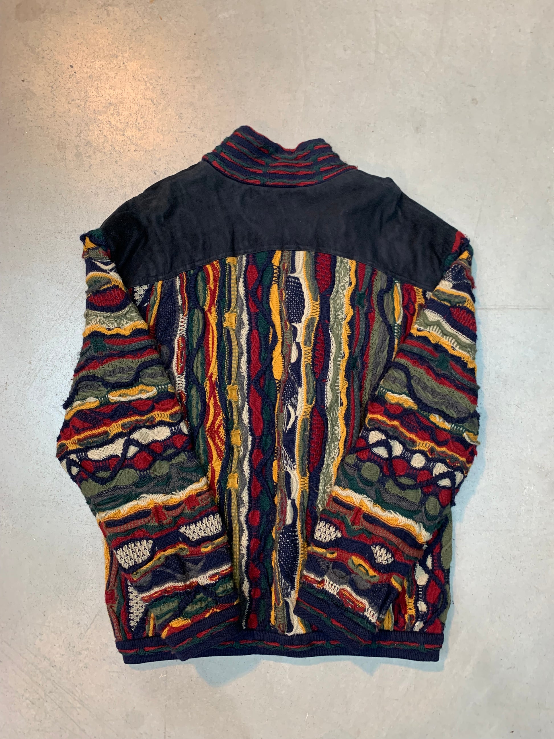 Rare COOGI Australia Black Zip Jacket with Multicolor 3D Knitted Pattern Sleeves, Iconic Vintage Streetwear Men's XL Size Retro Outerwear