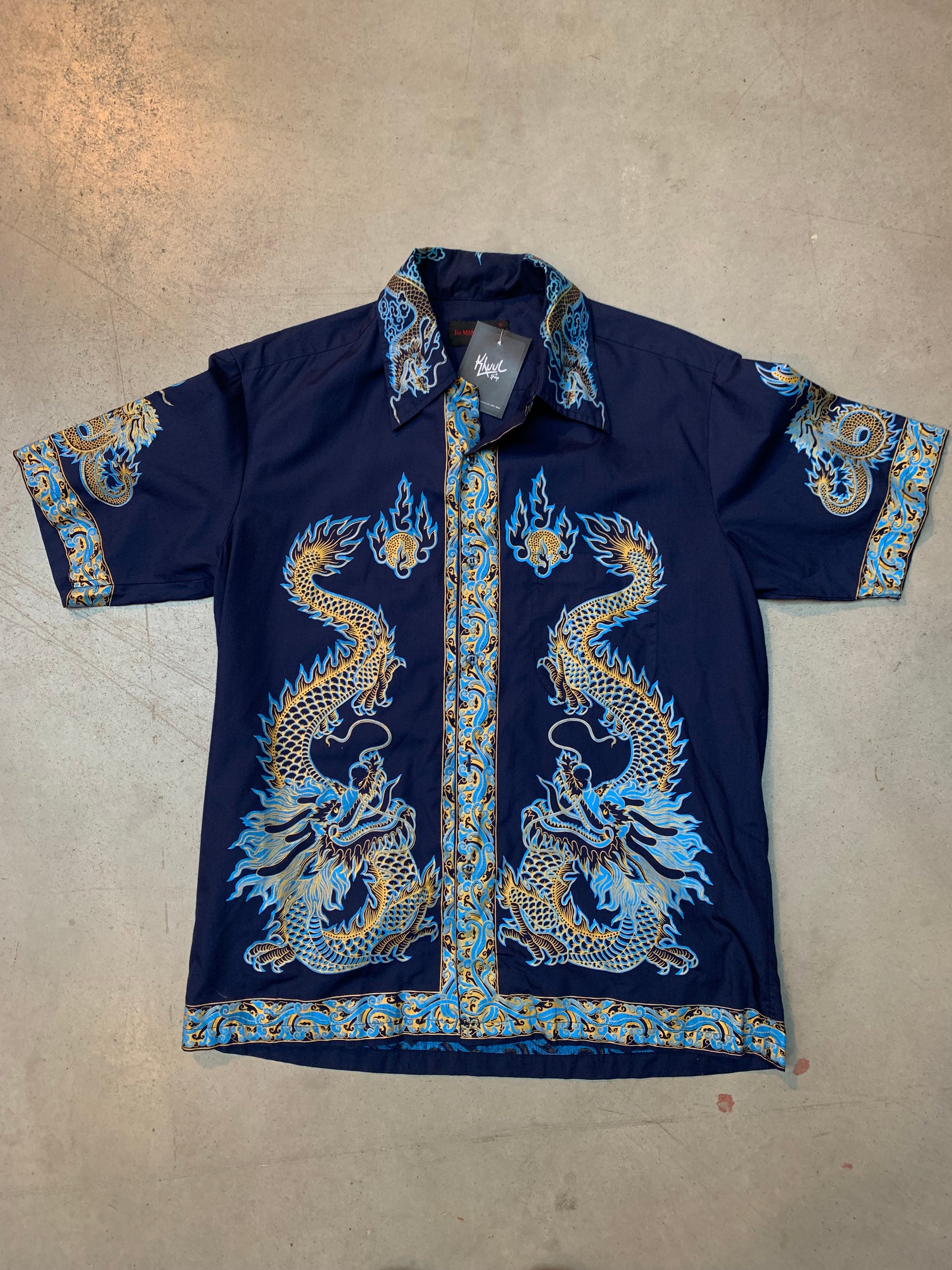 Vintage "for MAN of ACTION" Navy Blue Short Sleeve Button Up Shirt with Bold Golden Blue Dragon Print, Asian-Inspired Streetwear XXL Fit, Statement Collared Shirt for Retro Y2K Fashion, Festivals, or Collector Wardrobe Piece