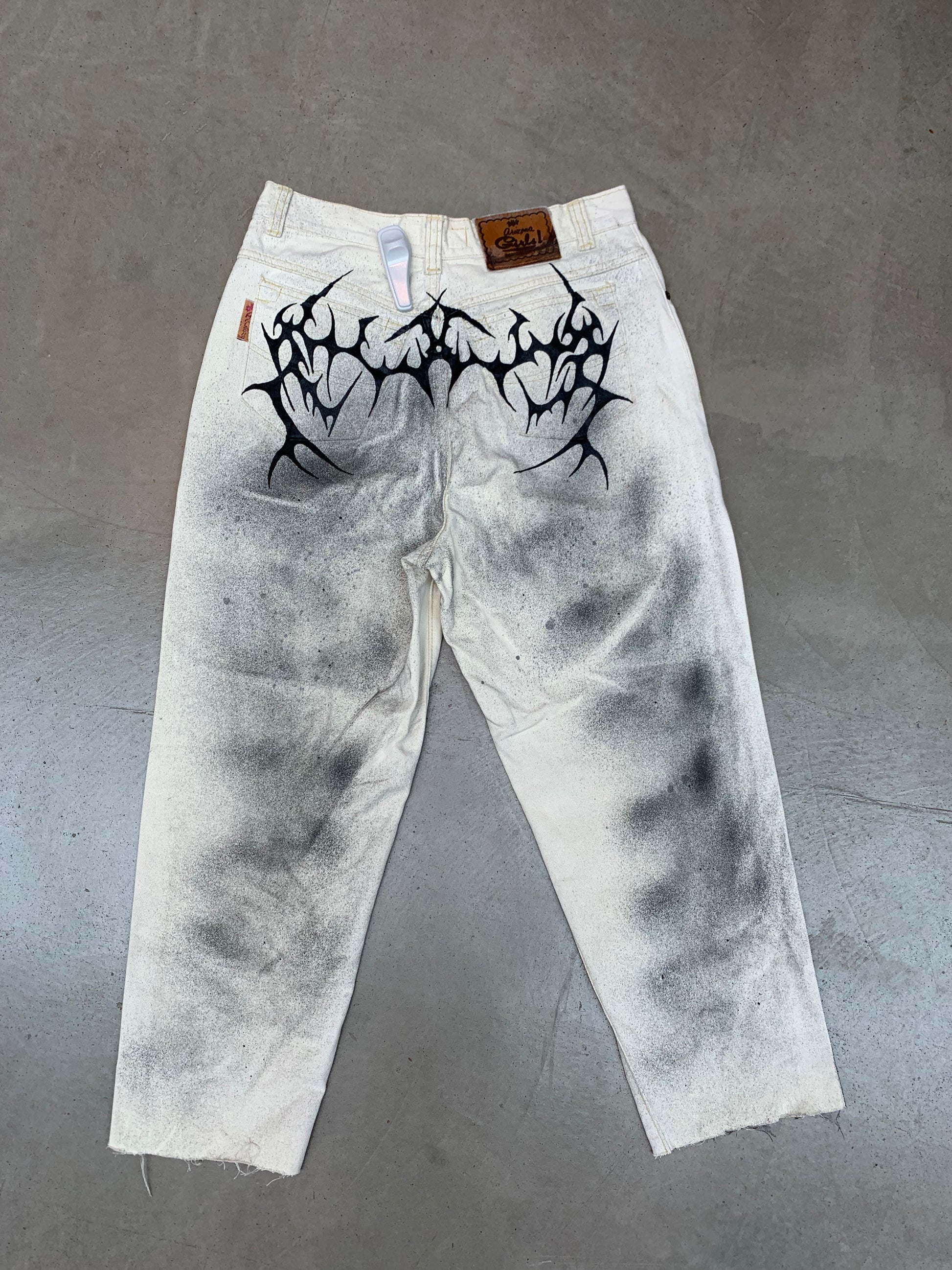 Hand Painted White Women Pants With Black Spray Art And Abstract Graphic Back Design Unique Streetwear Statement