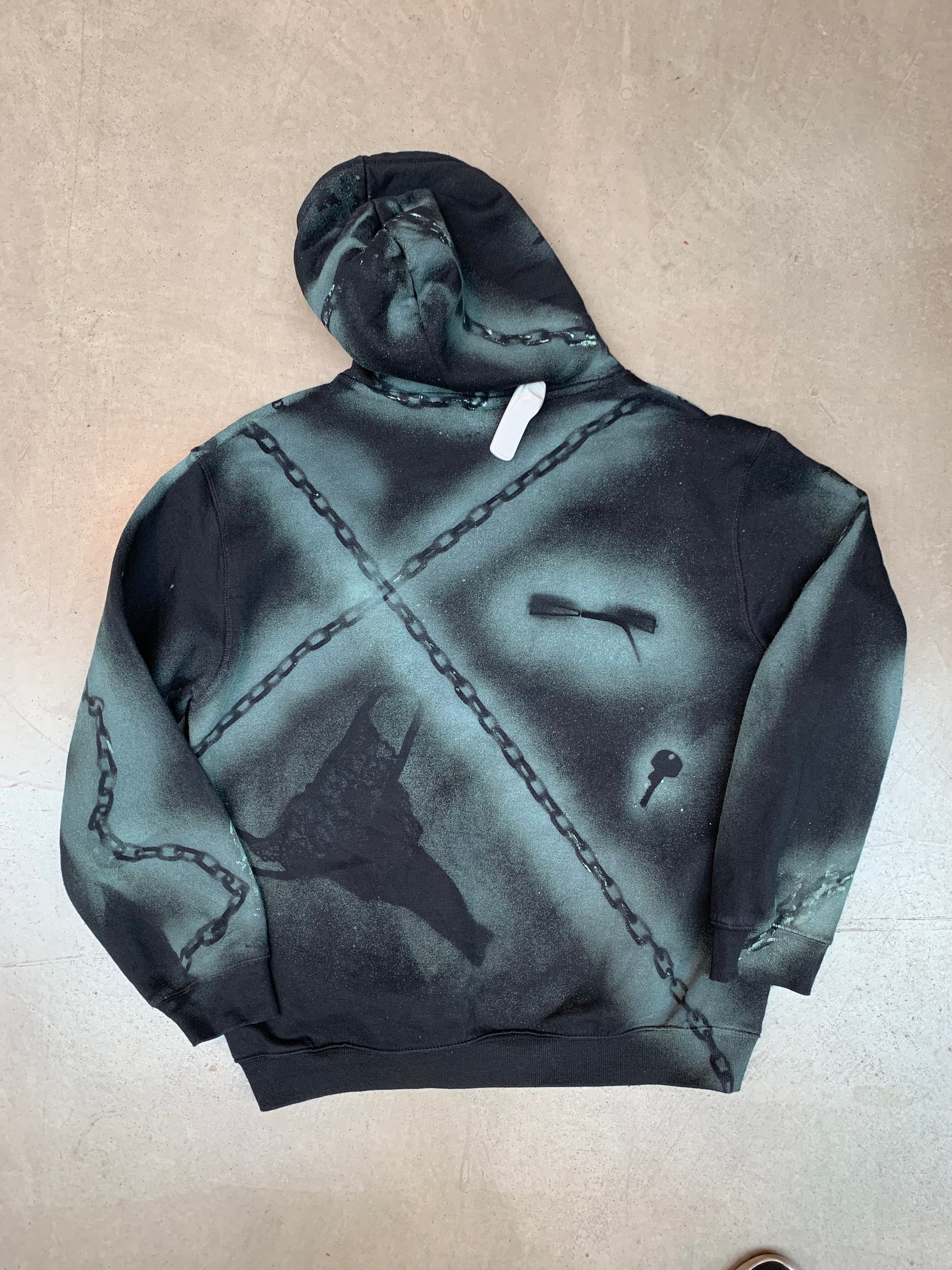 Hand Painted Women Large Black Green Hoodie With Chains Stencil Art Graphic Spray Painted Unique Streetwear