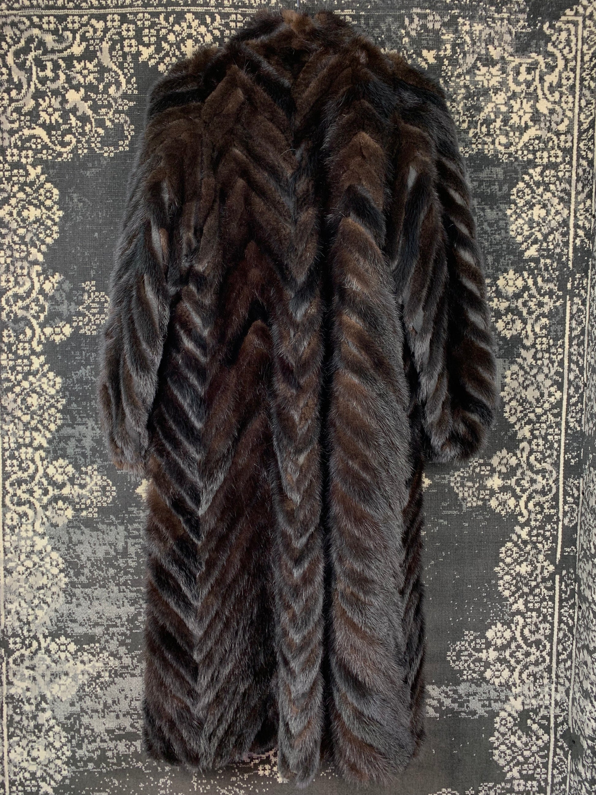 Kertun Turkis Turku Vintage Long Black Mink Fur Coat with Chevron Pattern, Hidden Hook Closures & Full Satin Lining – L