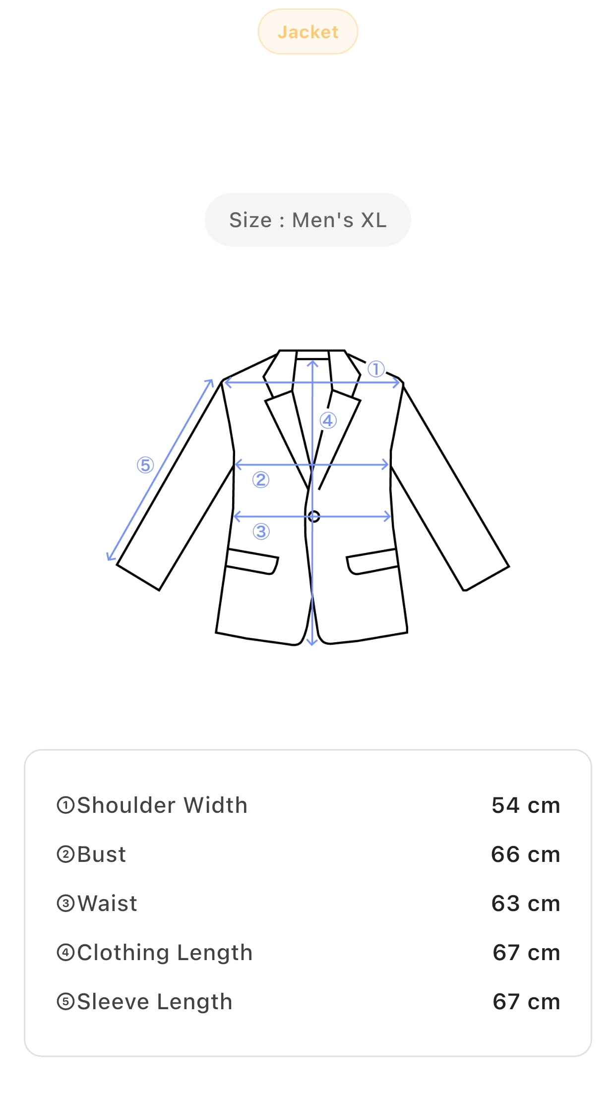 Size: Men's XL – Shoulder Width 54 cm, Bust 66 cm, Waist 63 cm, Clothing Length 67 cm, Sleeve Length 67 cm