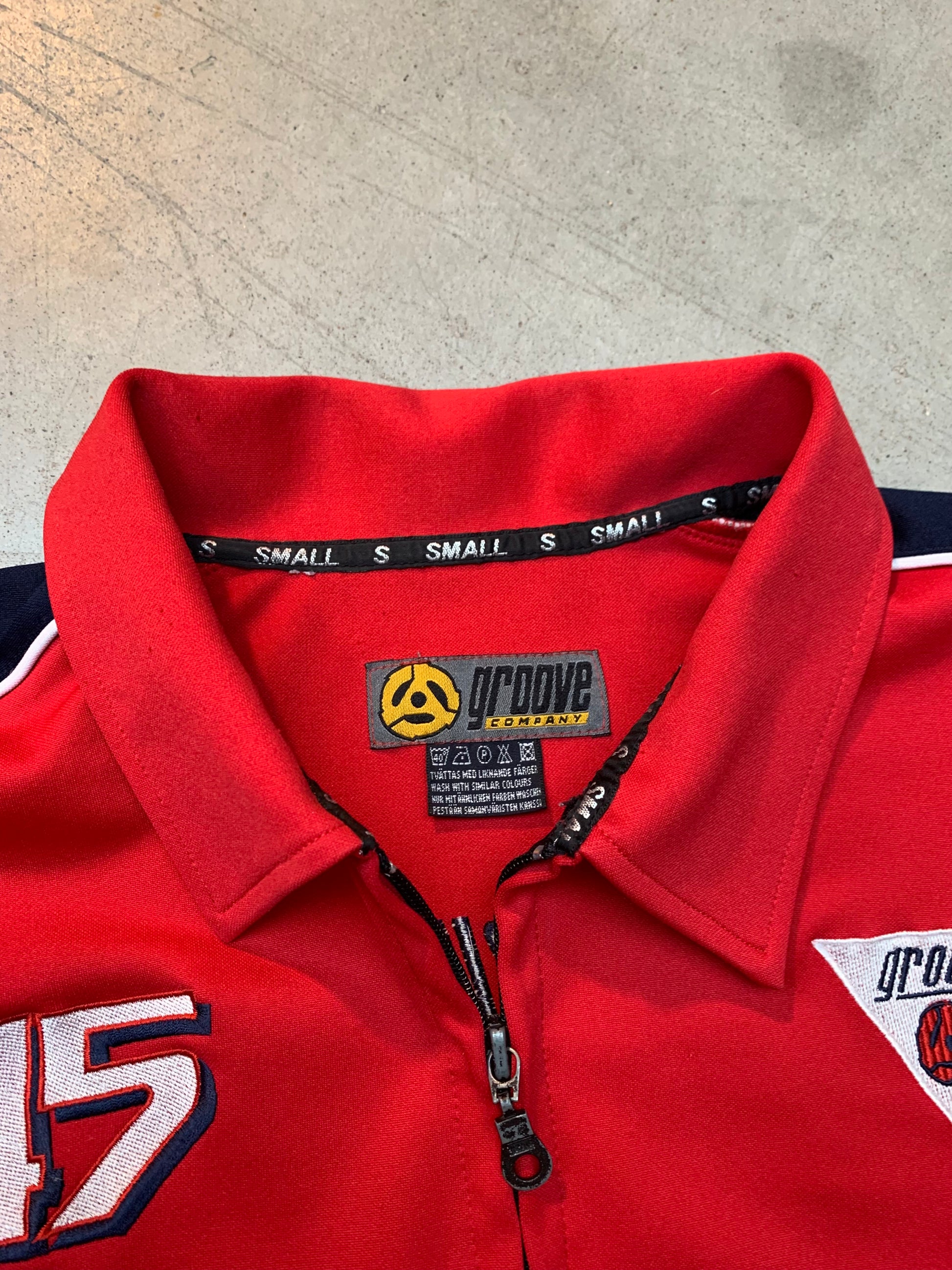 Men’s Vintage Groove Racing-Style Short Sleeve Shirt – Red & Navy Blue Polo Tee with Zipper Collar and Bold Logos, Y2K Streetwear Shirt Size S