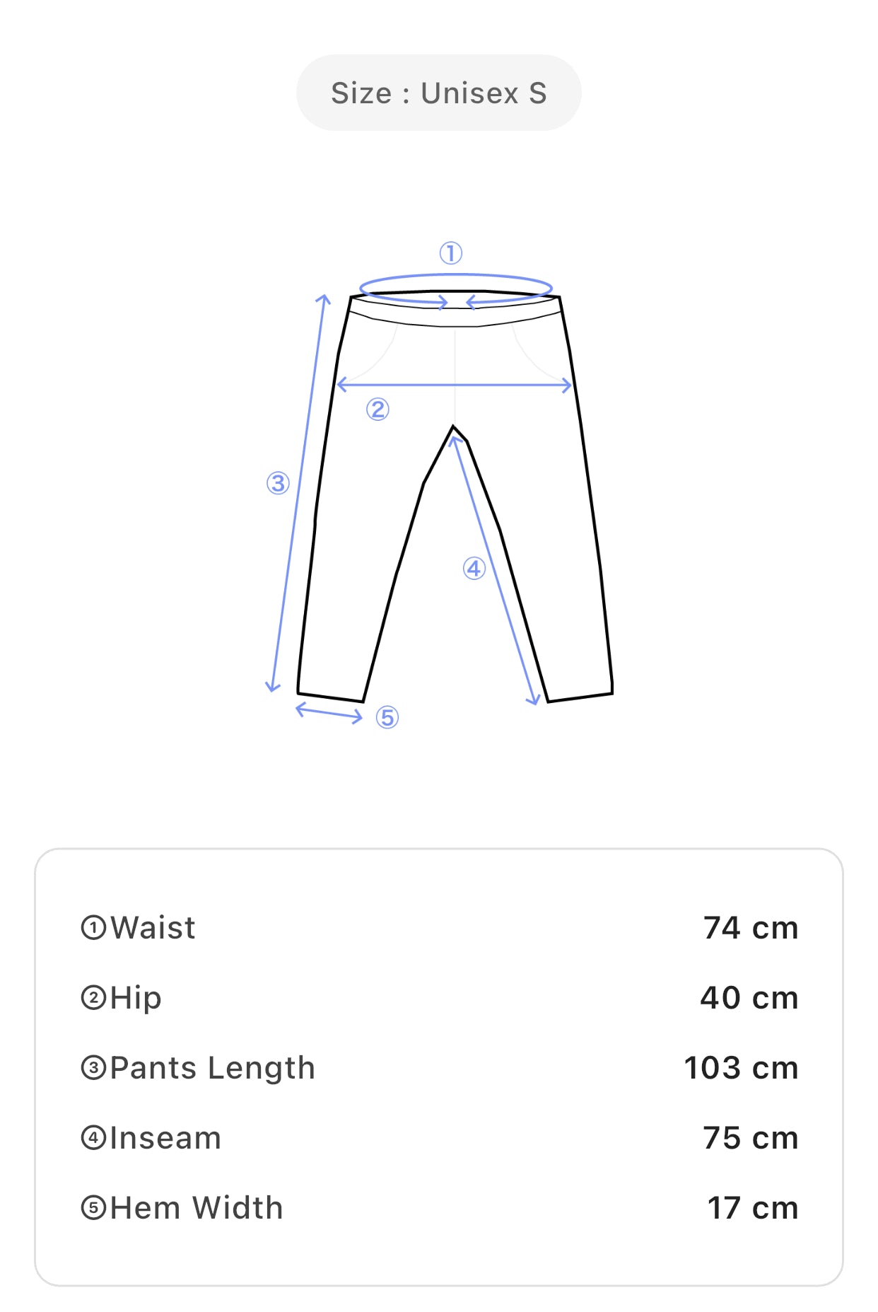 Size: Men S – Waist: 74 cm, Hip: 40 cm, Pants Length: 103 cm, Inseam: 75 cm, Hem Width: 17 cm