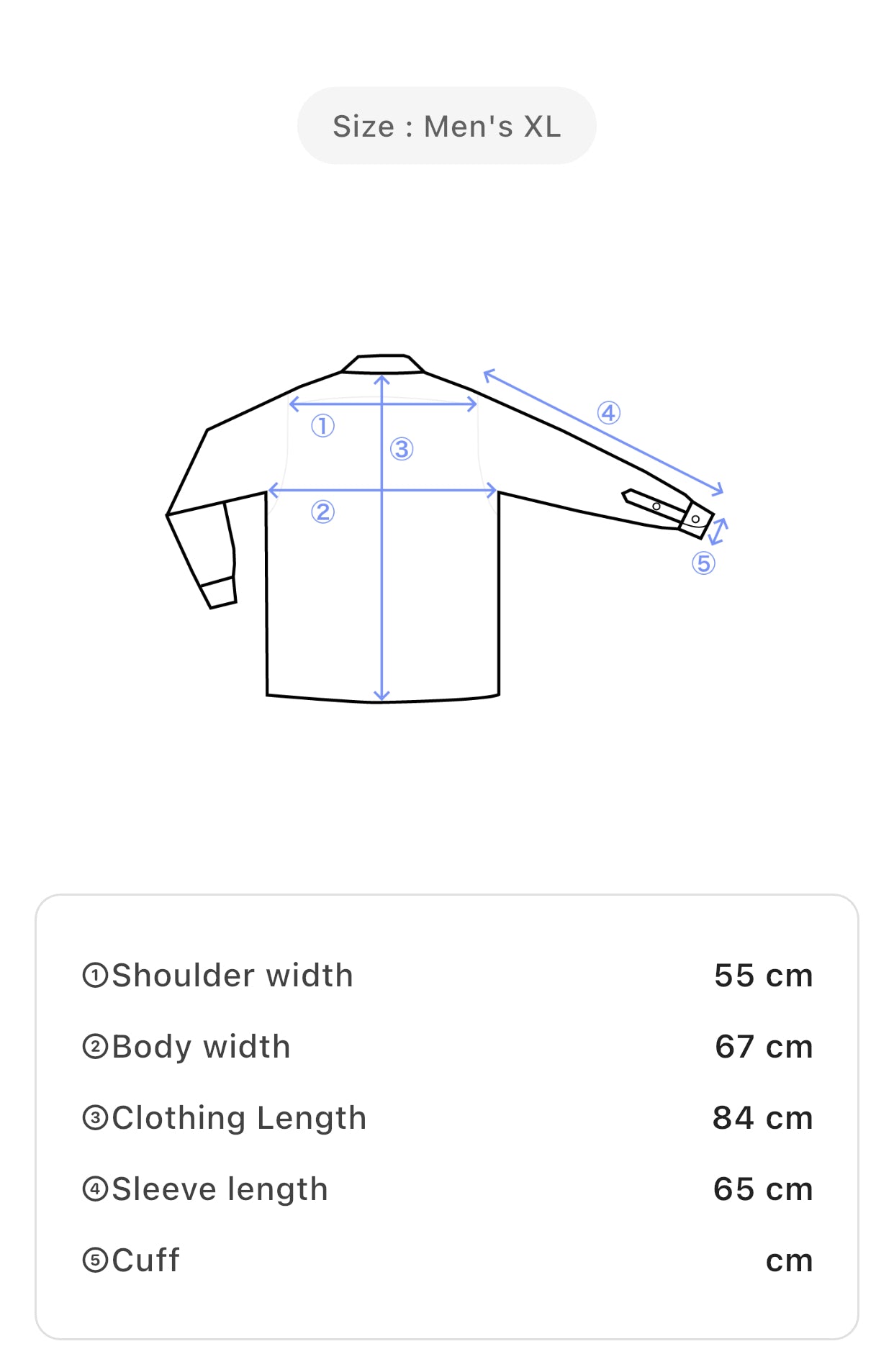 Size: Men’s XL, Shoulder Width: 55 cm, Body Width: 67 cm, Clothing Length: 84 cm, Sleeve Length: 65 cm