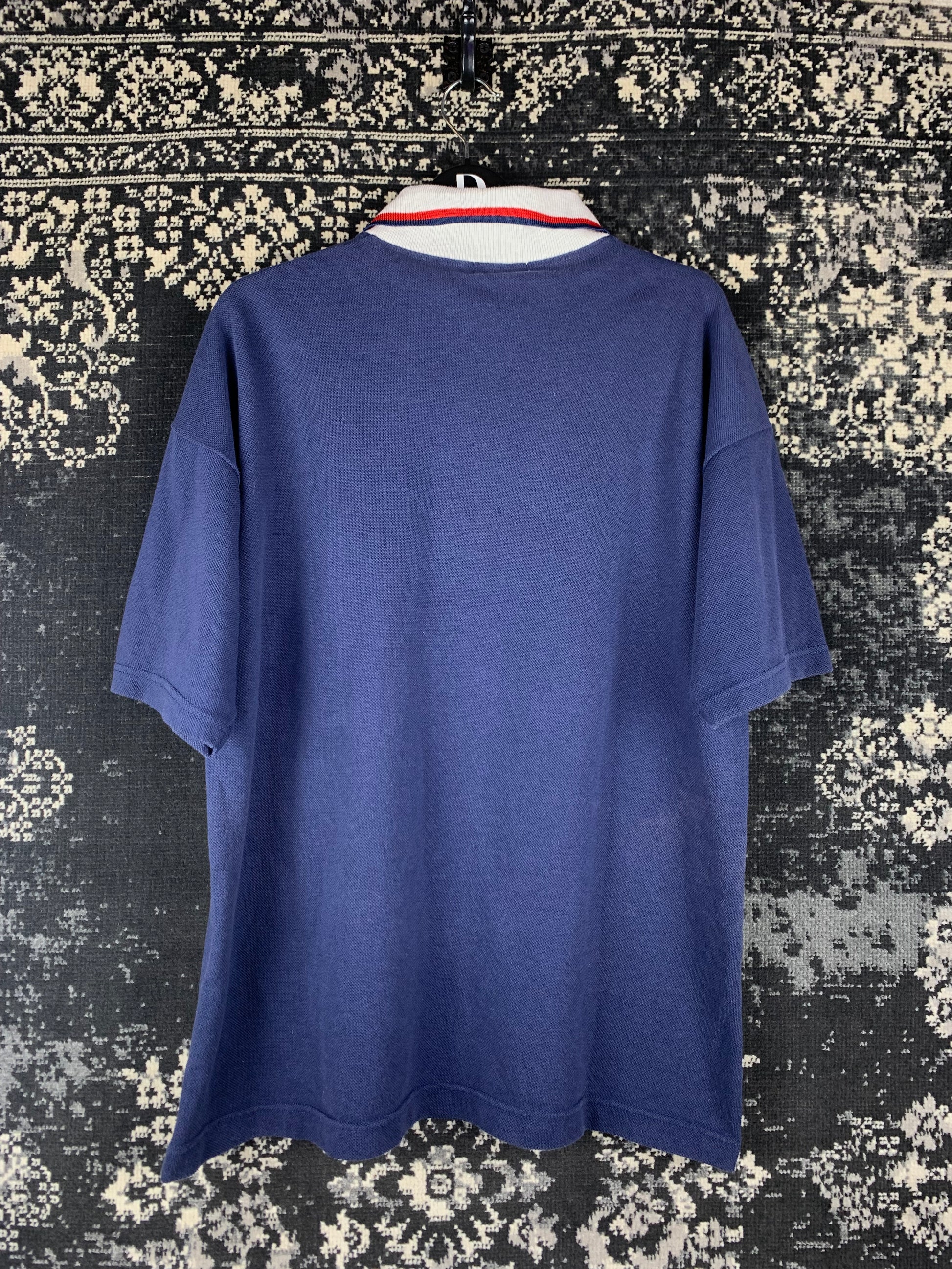 Men's Vintage Burberrys Polo Shirt – Navy Blue Short Sleeve with Red Equestrian Logo & White Contrast Collar