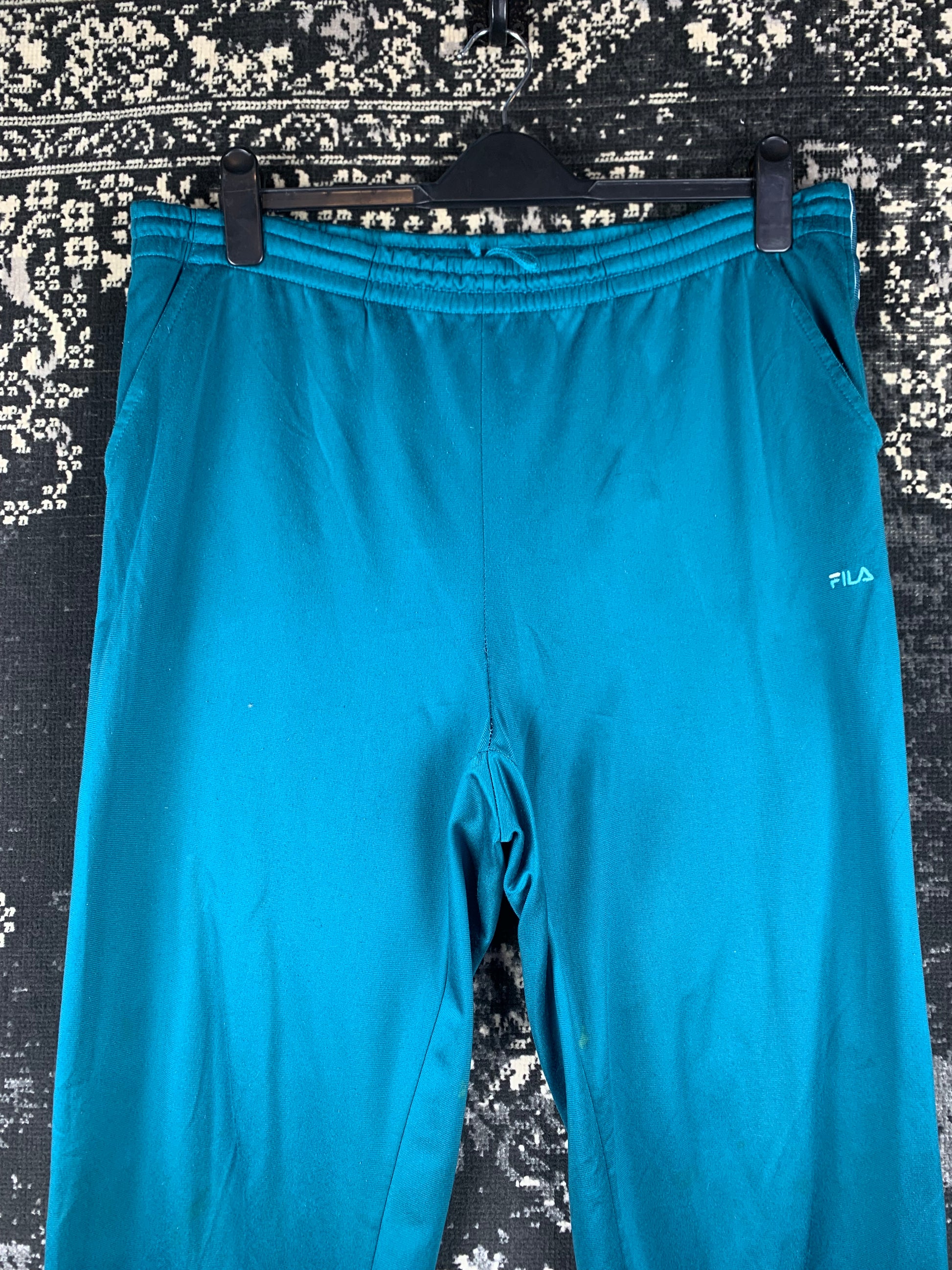 Men's Vintage Fila Logo Tape Track Pants – Teal Blue 90s Retro Sportswear Joggers