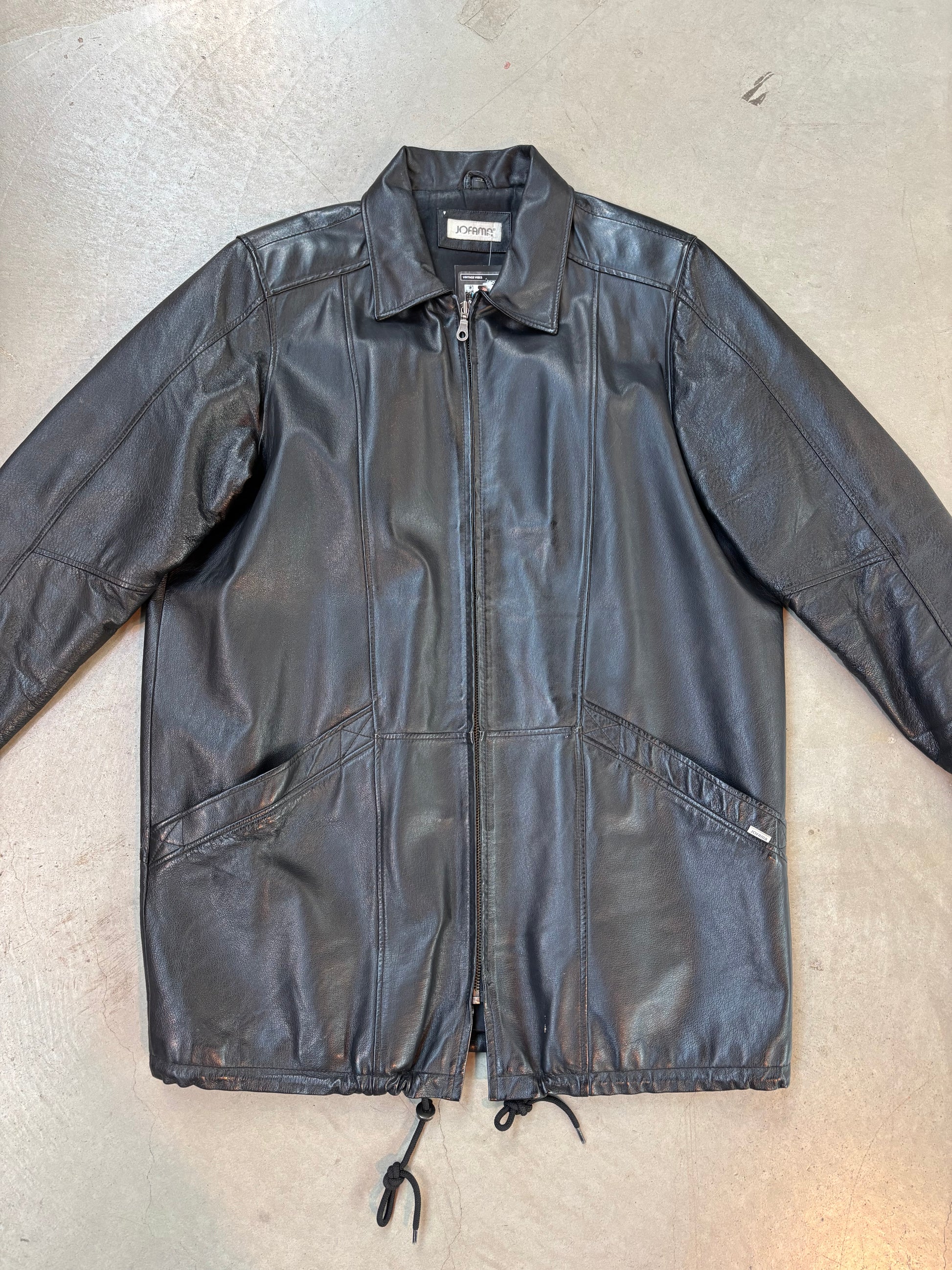 Jofama Black Leather Jacket Men's L Vintage Zip Up Coat Classic Longline Outerwear Drawstring Hem Retro Style