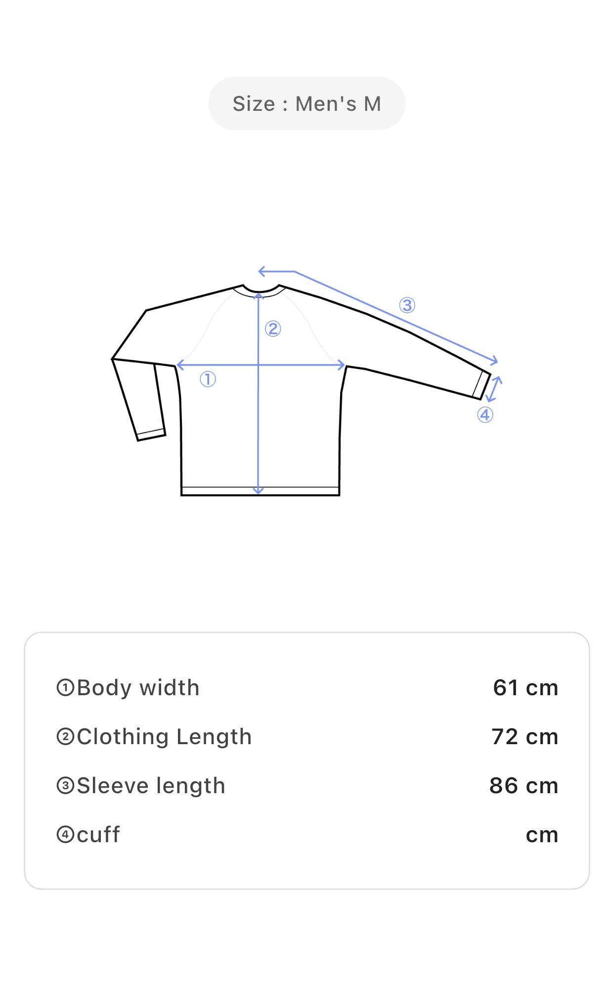 Size: Men’s M (Body width 61 cm, Clothing length 72 cm, Sleeve length 86 cm)