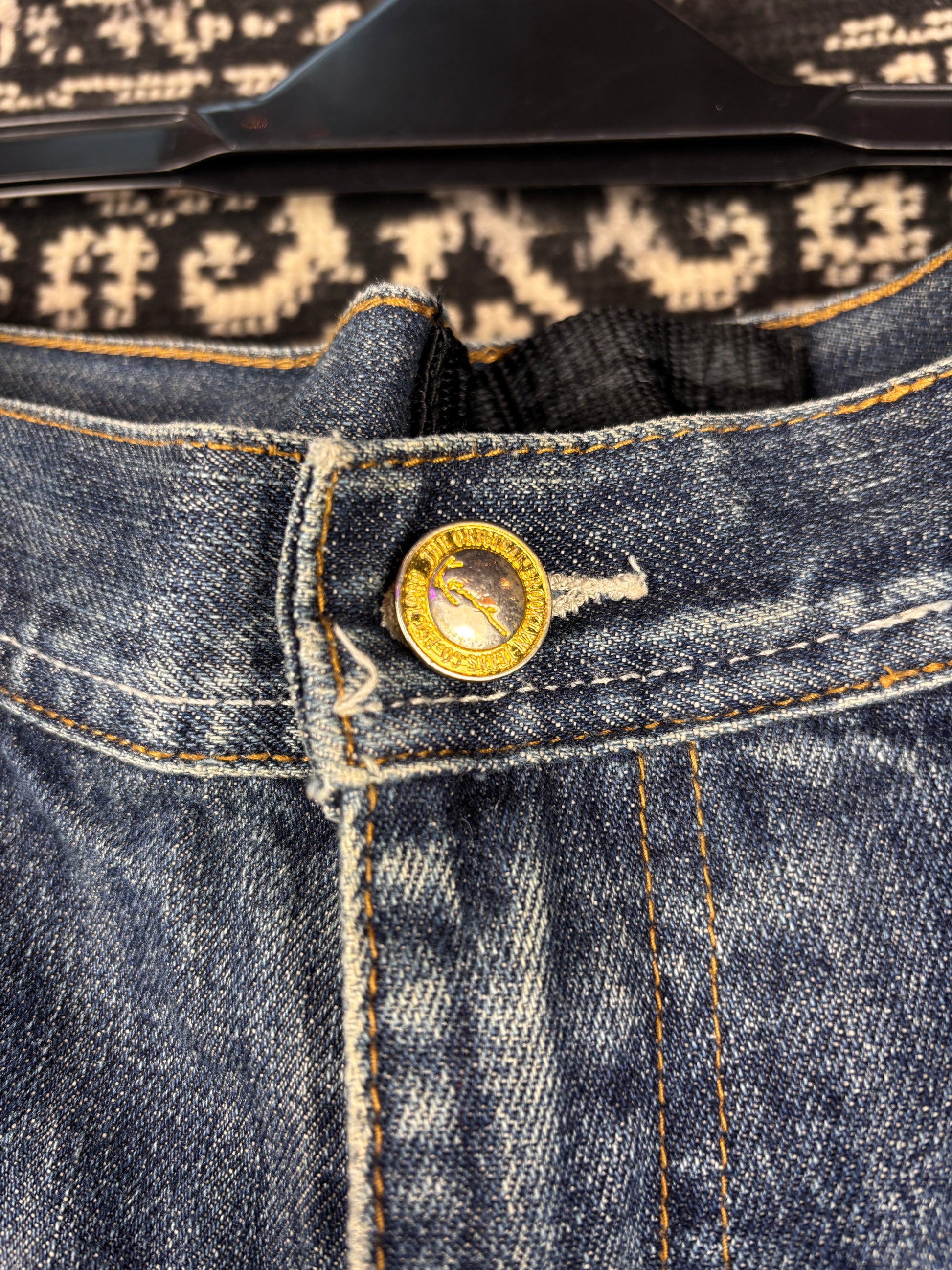 Color: Medium blue vintage wash denim with heavy fade and whiskering