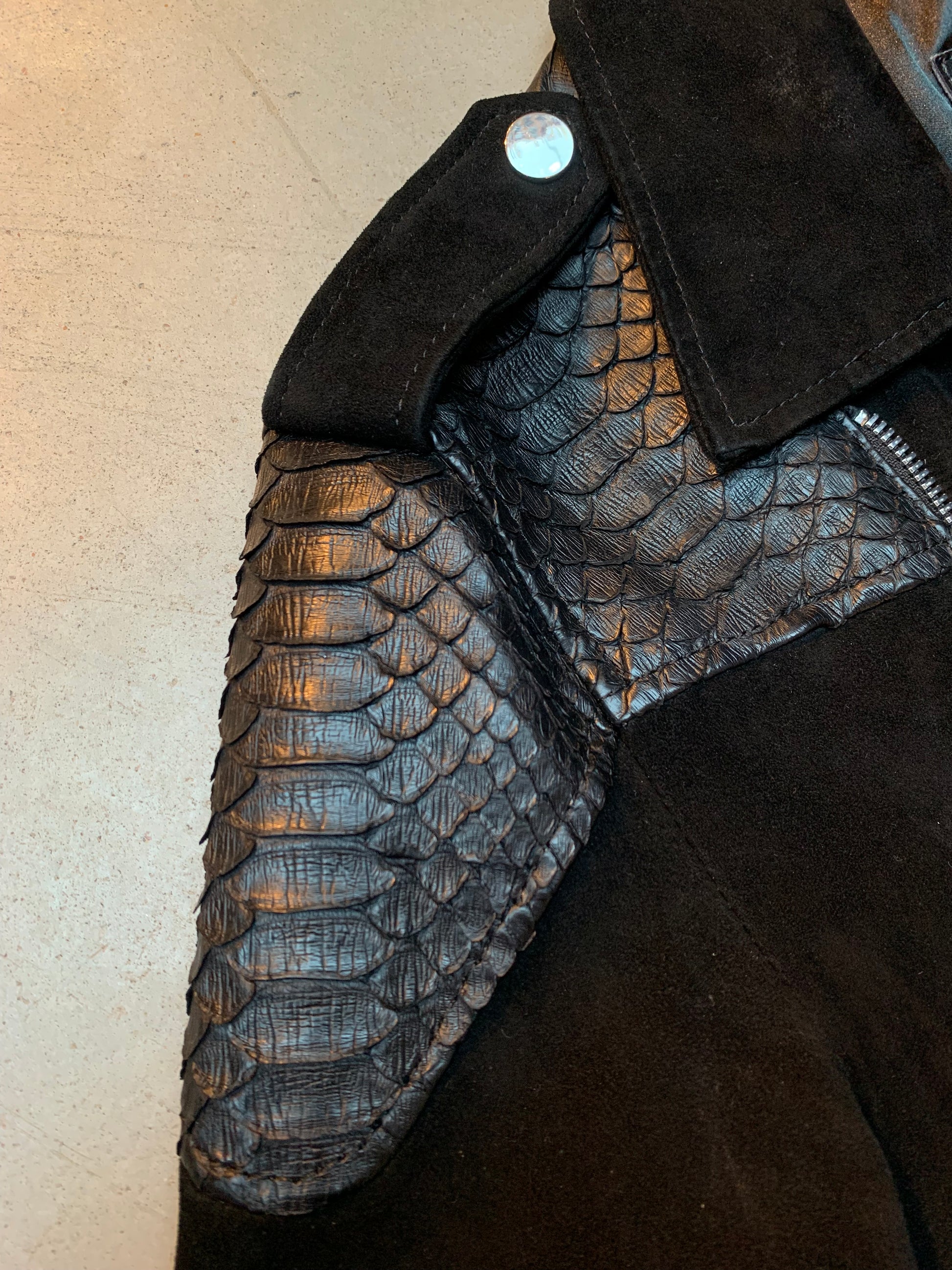 Vintage Unisex SUSUDIO Black Suede Biker Jacket with Snakeskin Accents – Urban Couture Style with Zipper Detailing