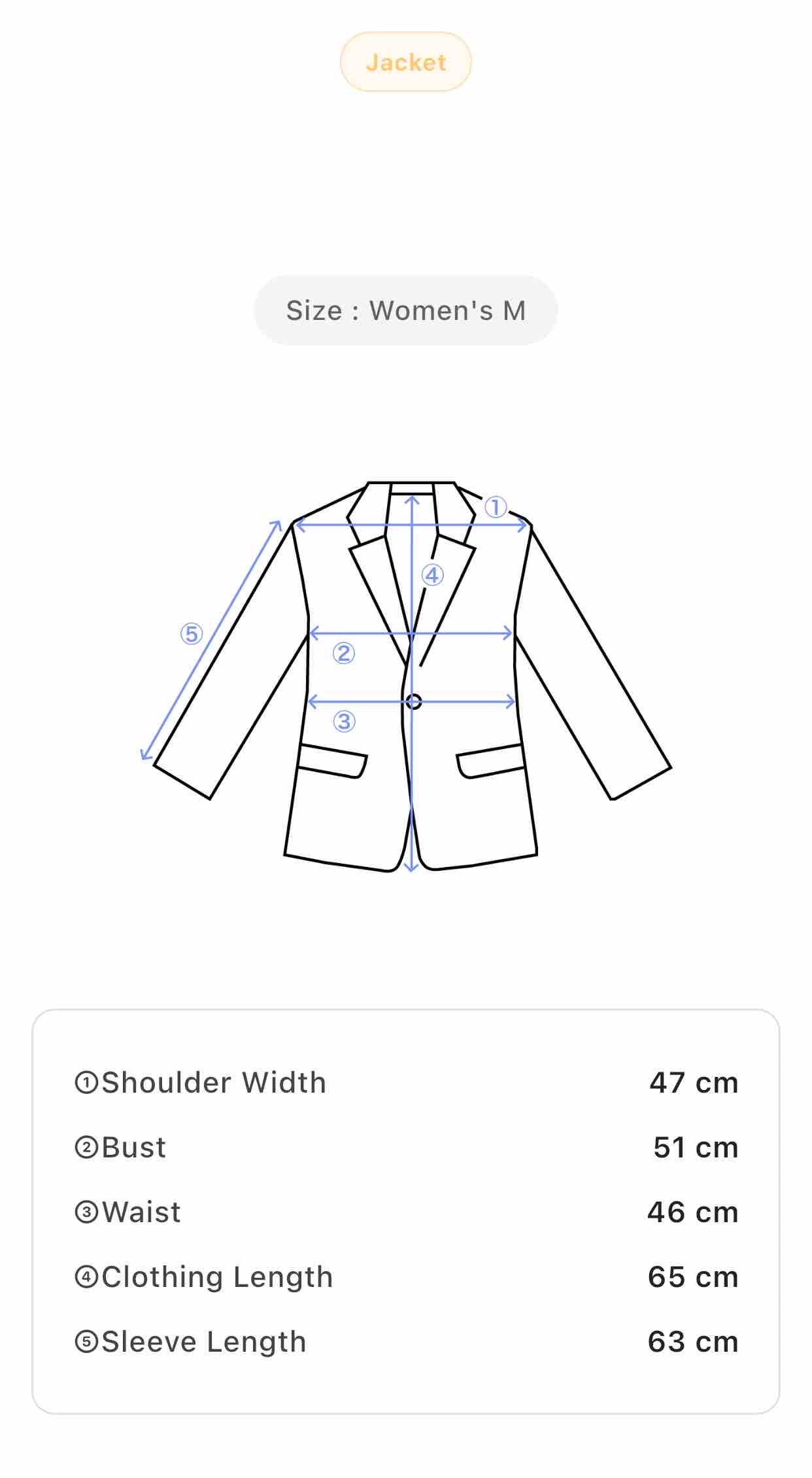 Size: Women's M — Shoulder: 47 cm, Bust: 51 cm, Waist: 46 cm, Length: 65 cm, Sleeve: 63 cm
