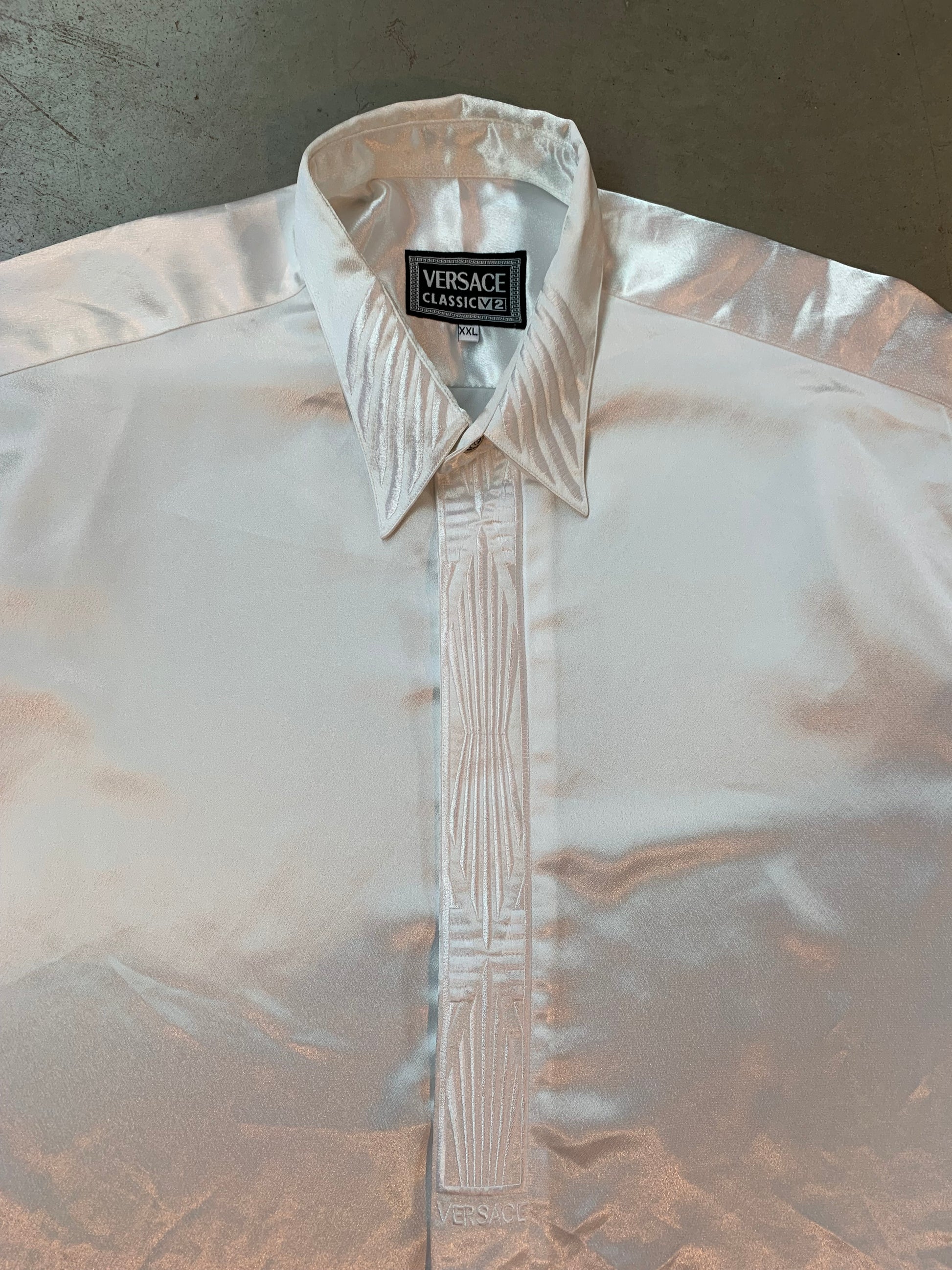 Versace Classic V2 Men’s XXL White Satin Short Sleeve Shirt Luxury Designer Collared Button Down
