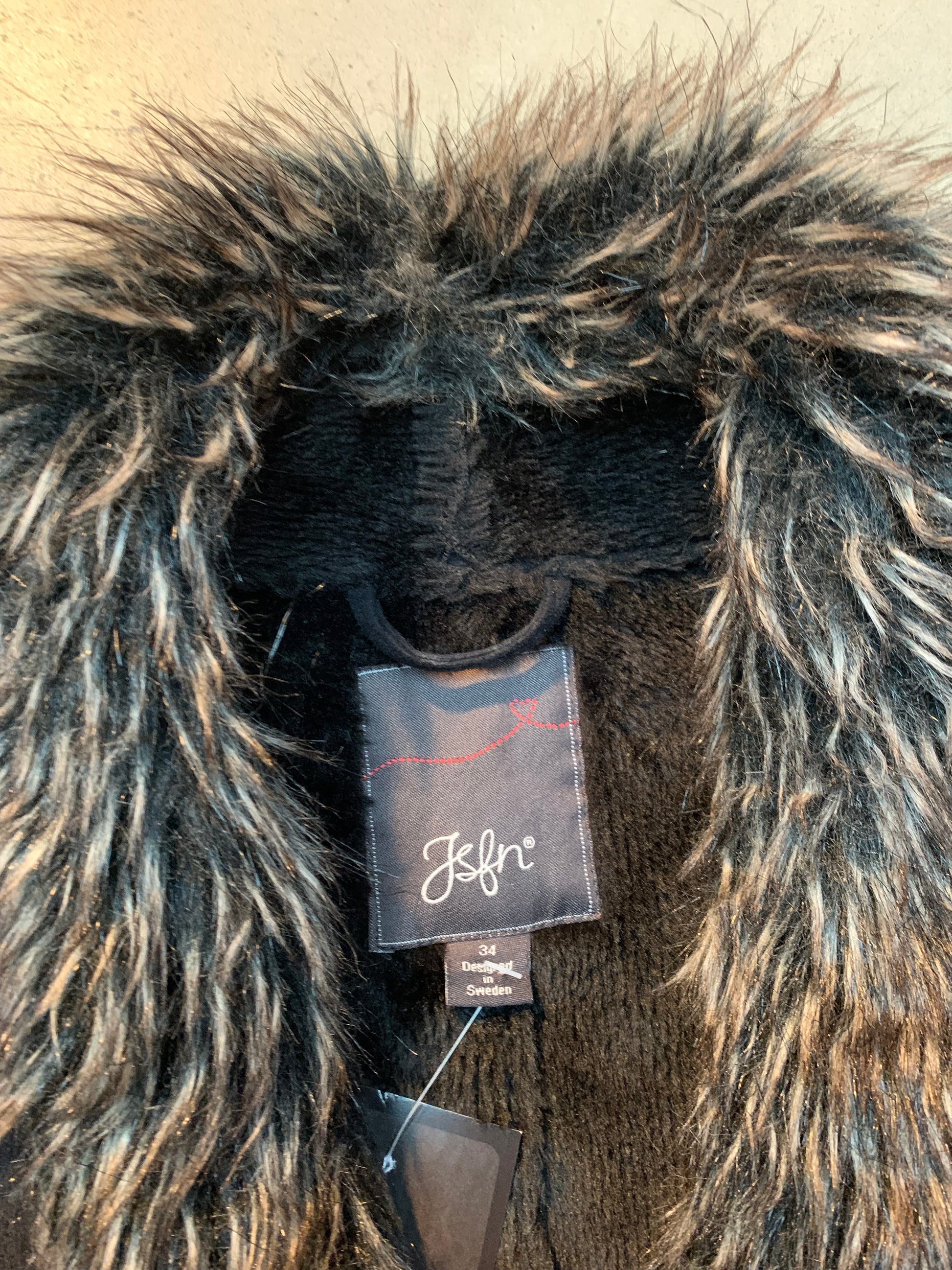 Vintage Women's Black Faux Suede Fur Trim Coat – 2000s JSFN Sweden Winter Jacket with Longline Fit, Shaggy Faux Fur Cuffs, Collar & Hem, Elegant Flared Cut