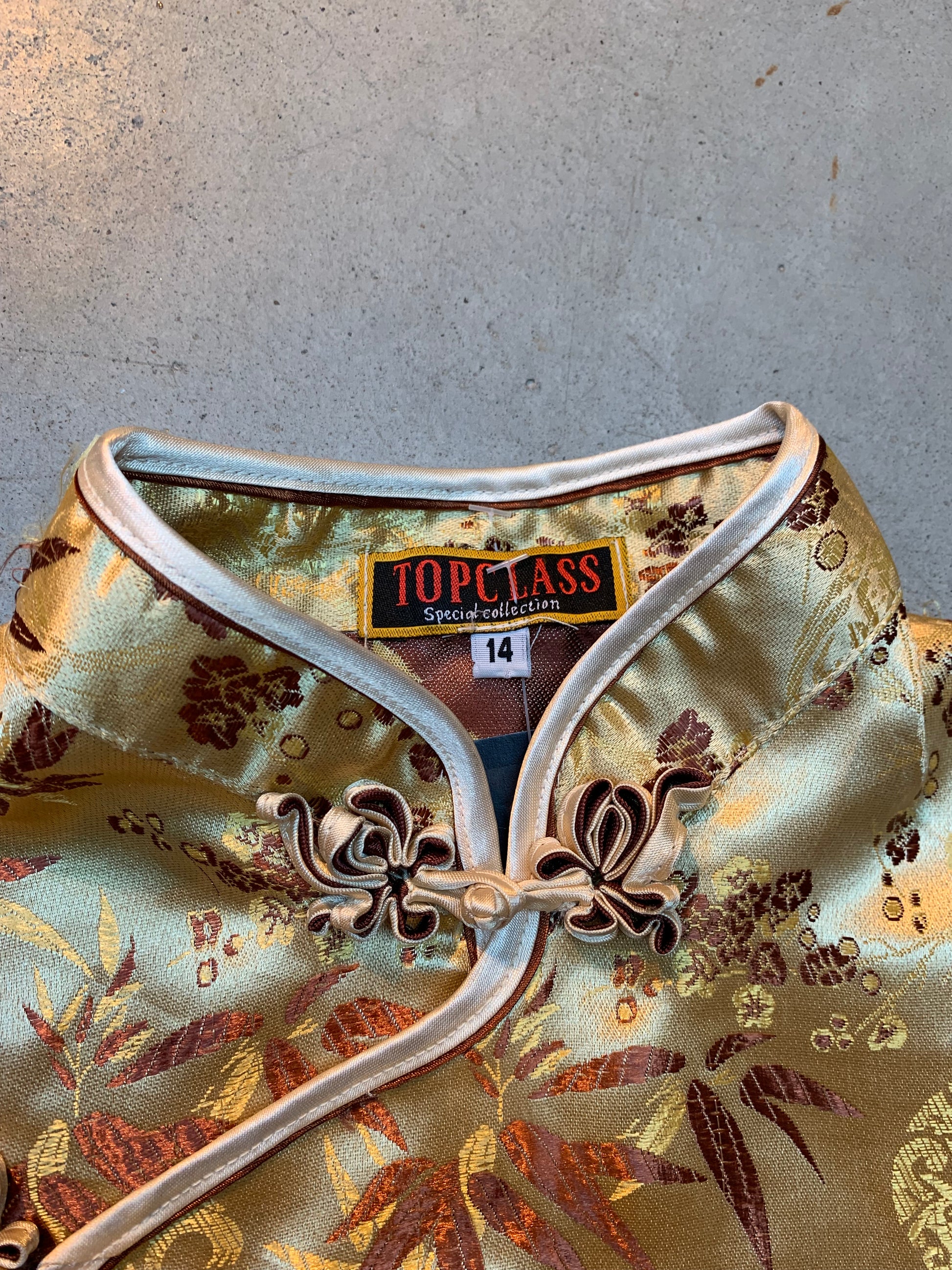 Vintage Women's Chinese Style Fitted Cheongsam Dress with Bamboo and Floral Pattern – Pale Gold and Brown Short Sleeve
