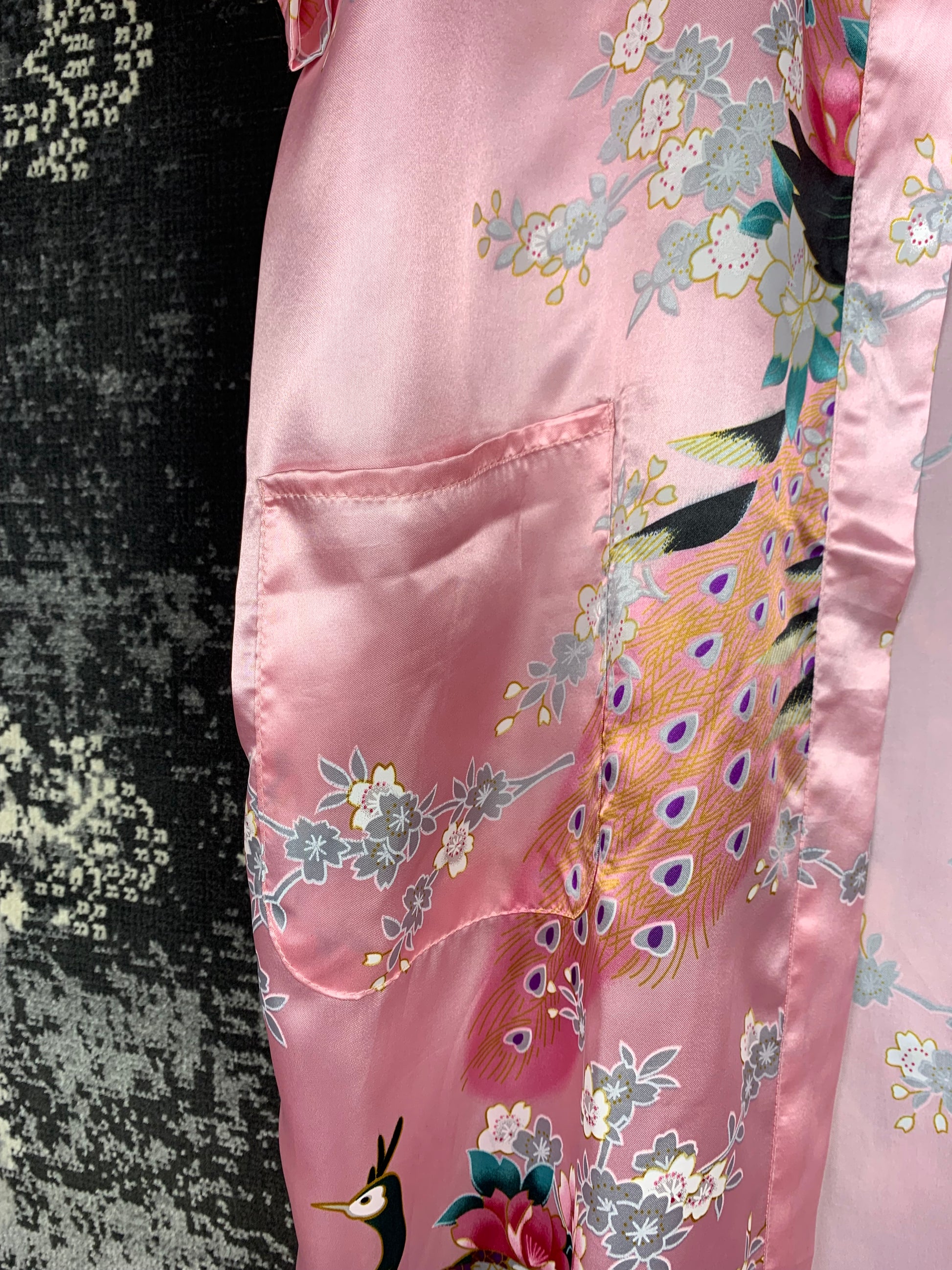 Women's Pink Japanese-Style Silk Kimono Robe with Peacock and Floral Print, Elegant Long Satin Lounge Robe, Vintage-Inspired Lightweight Nightwear, Traditional Asian-Inspired Sleepwear