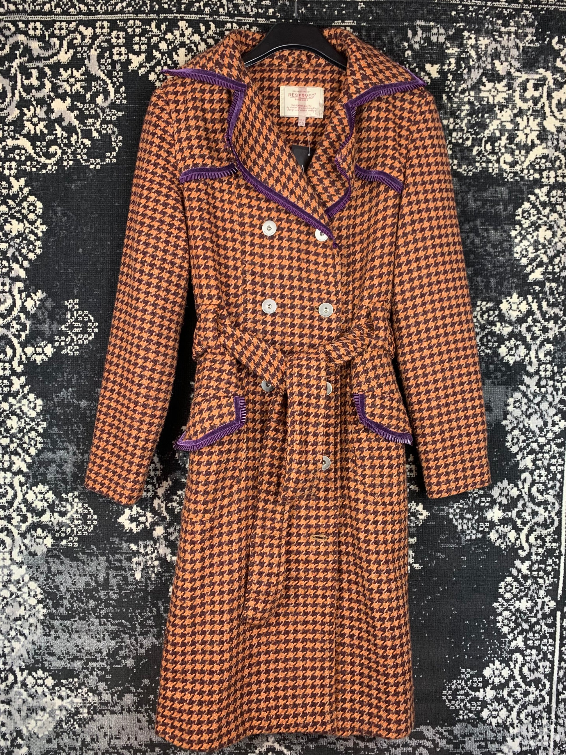 Reserved Vintage Houndstooth Wool Blend Coat with Purple Trim – Double-Breasted Long Belted Autumn Overcoat – Women's Size M – Retro Fall Fashion Outerwear with Button Cuffs and Lapel Collar