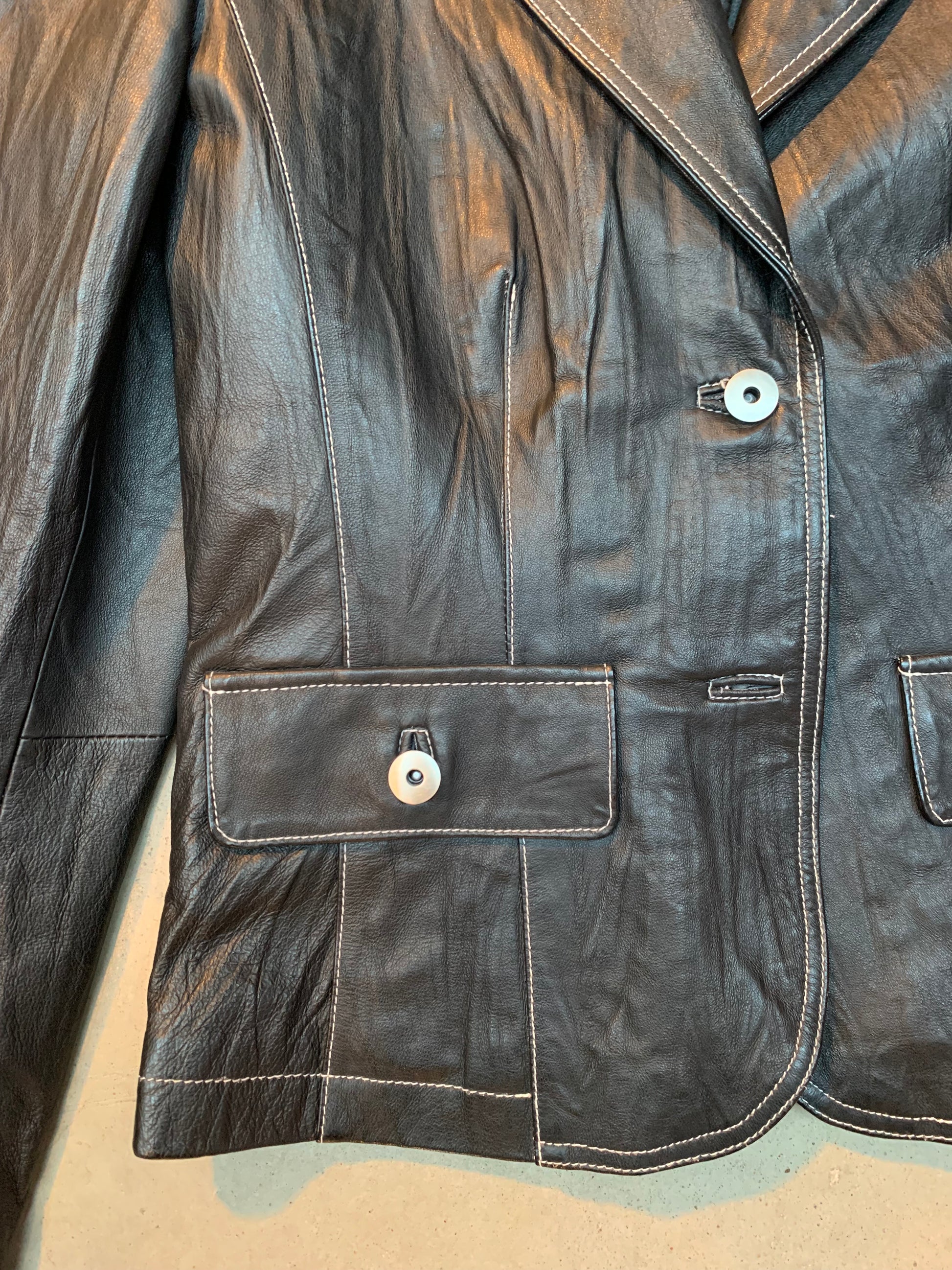 Women's Vintage Black Leather Button Up Jacket with Lapel Collar and Front Flap Pockets, Mid-Length Slim Fit Blazer Style Outerwear for Timeless Casual to Formal Looks
