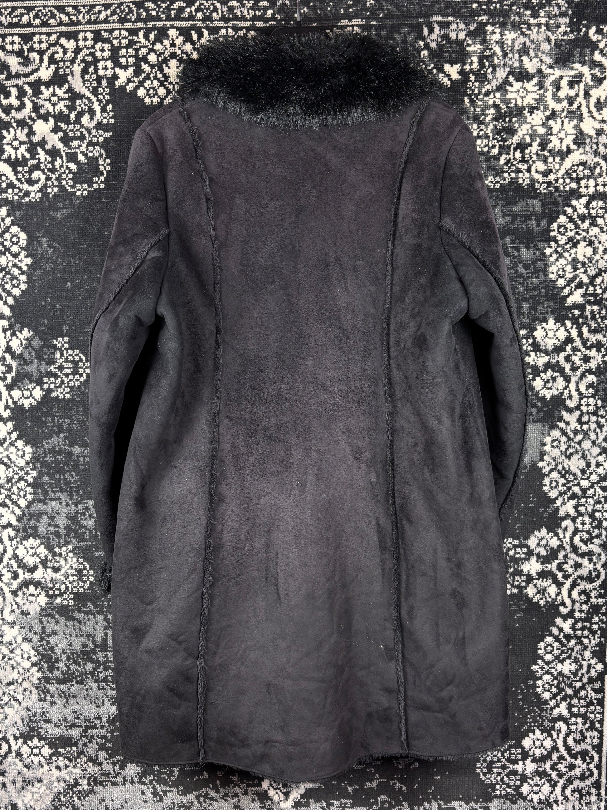 Women's Y2K Black Suede Duffle Coat with Faux Fur Trim – Toggle Closure – Long Winter Jacket – Size XXL