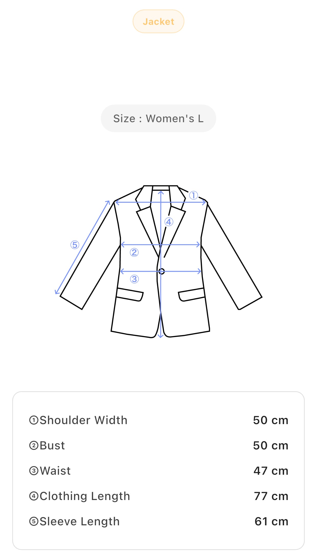 Size: Women’s L (Shoulder Width: 50 cm / Bust: 50 cm / Length: 77 cm / Sleeve Length: 61 cm)