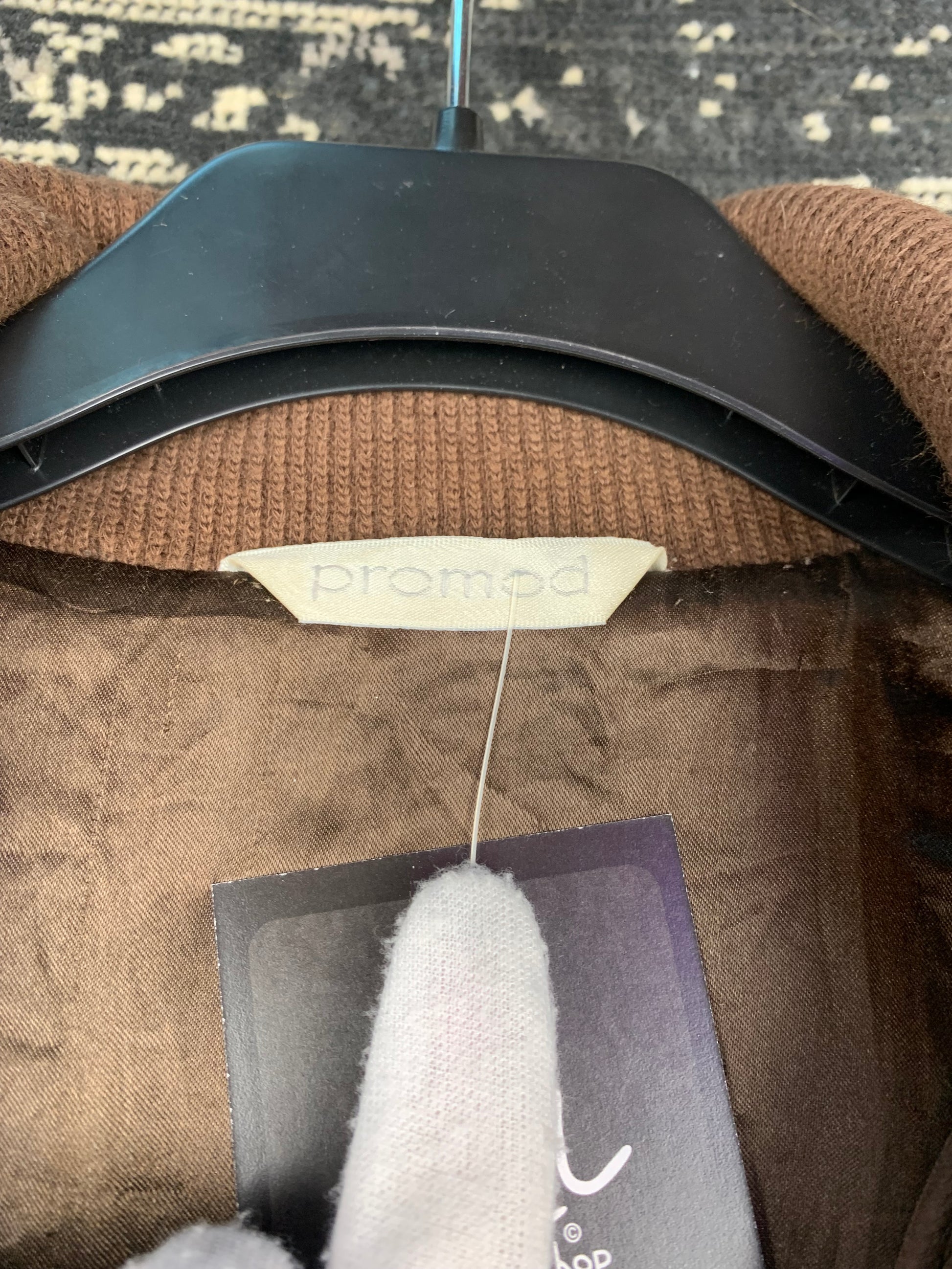 Color: Brown faux leather with ribbed knit collar, cuffs, and hem