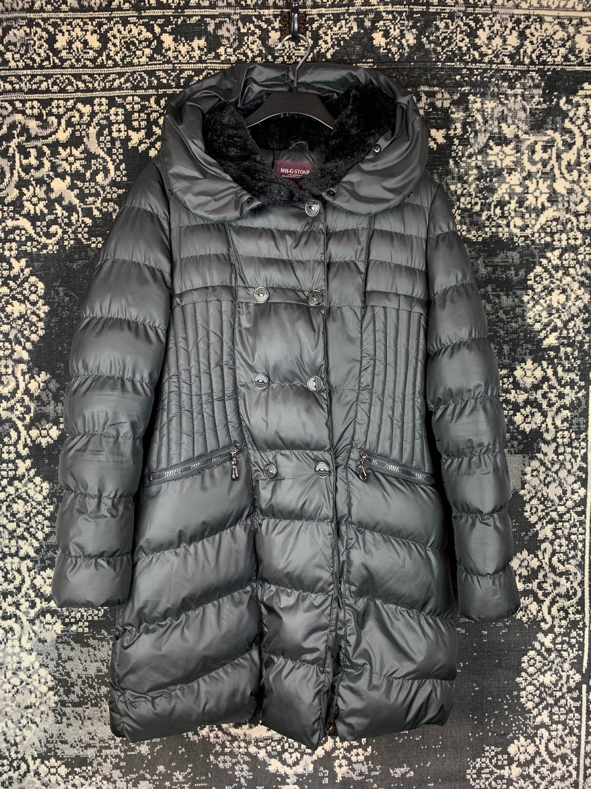 Y2K Black Long Puffer Jacket by MH-G.STONE - Quilted Winter Coat with Faux Fur Lining & Hood - Zip & Button Closure - Women's Medium - Cozy Streetwear Cold Weather Layer