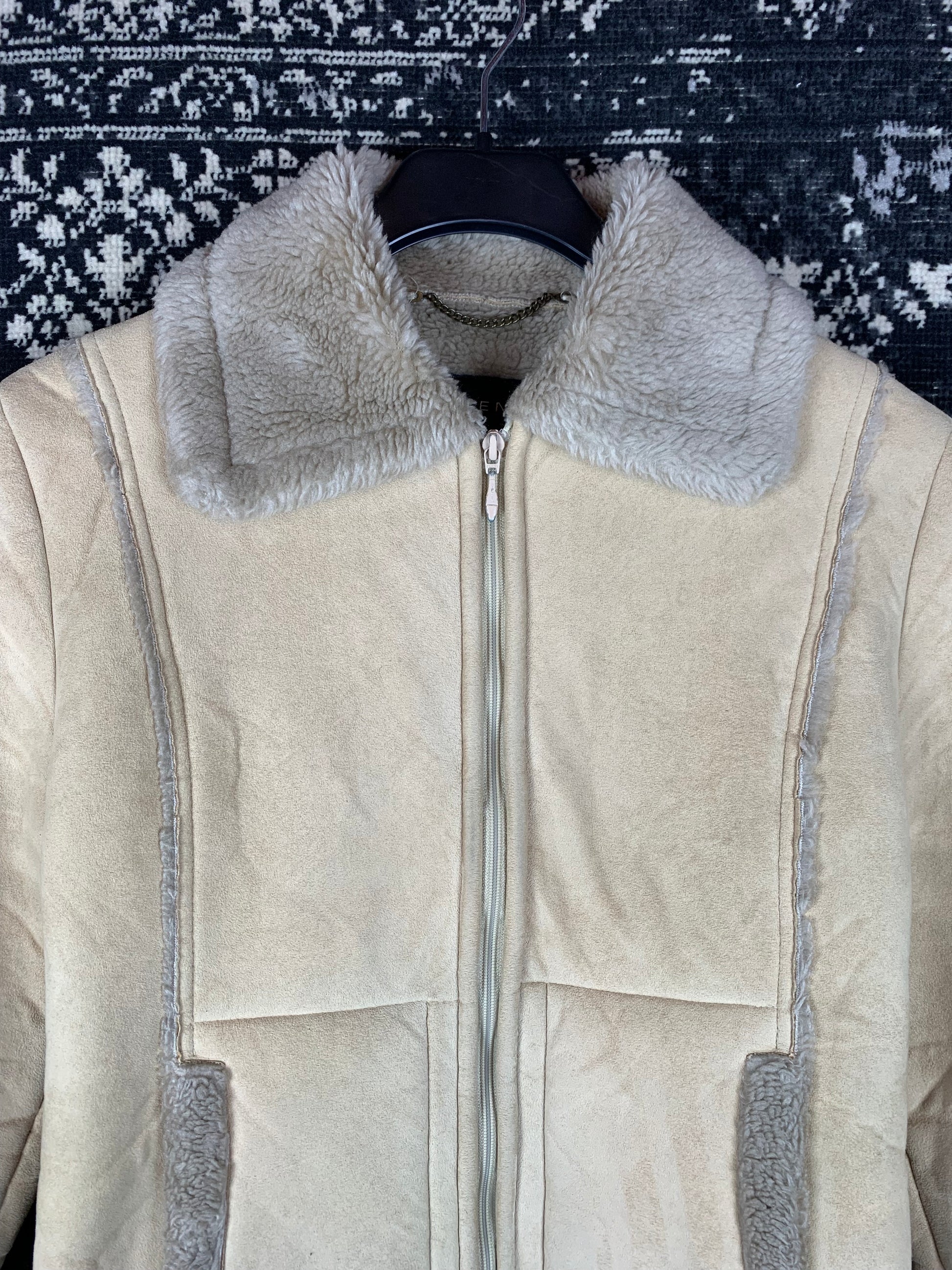 Klementi Y2K Style Beige Faux Suede Zip-Up Jacket with Soft Fleece Lining and Panel Stitch Detail - Cozy Winter Coat for Women - S - Vintage Inspired Outerwear
