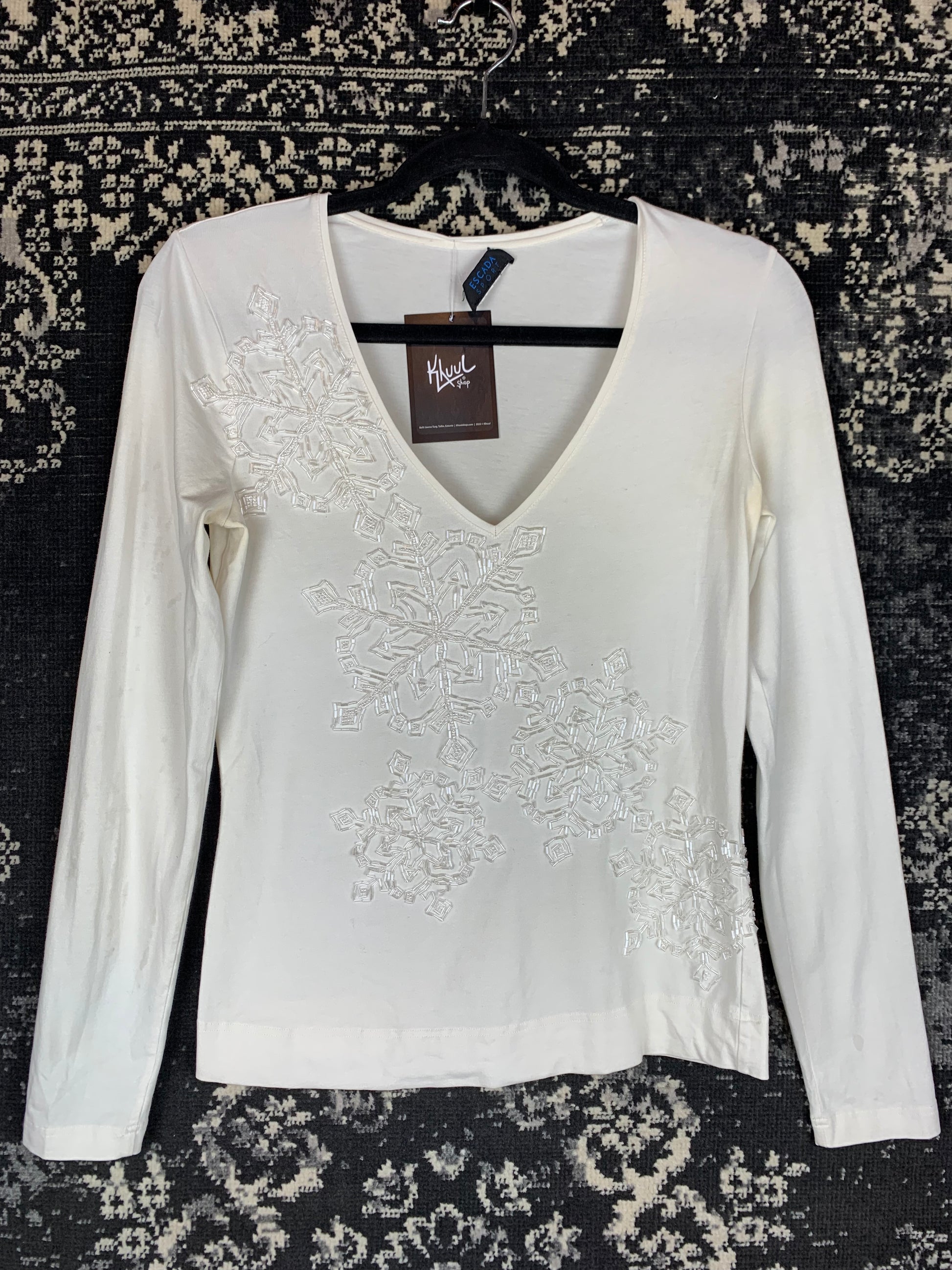 Women's Y2K White Beaded Long Sleeve Top – Escada Sport V Neck Shirt with Embroidered Snowflake Pattern – Elegant Winter S Tee