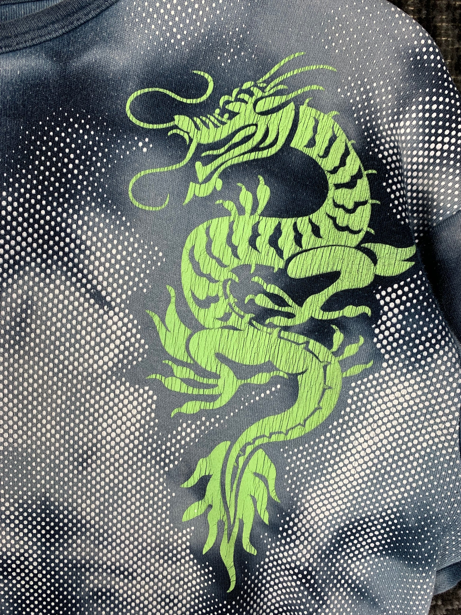 • Color: Dark blue tie-dye base with neon green dragon and tribal-style lettering