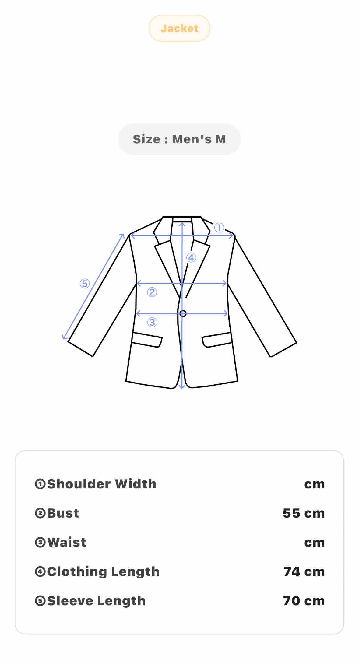 Size: Men’s M (Bust 55 cm, Clothing Length 74 cm, Sleeve Length 70 cm)