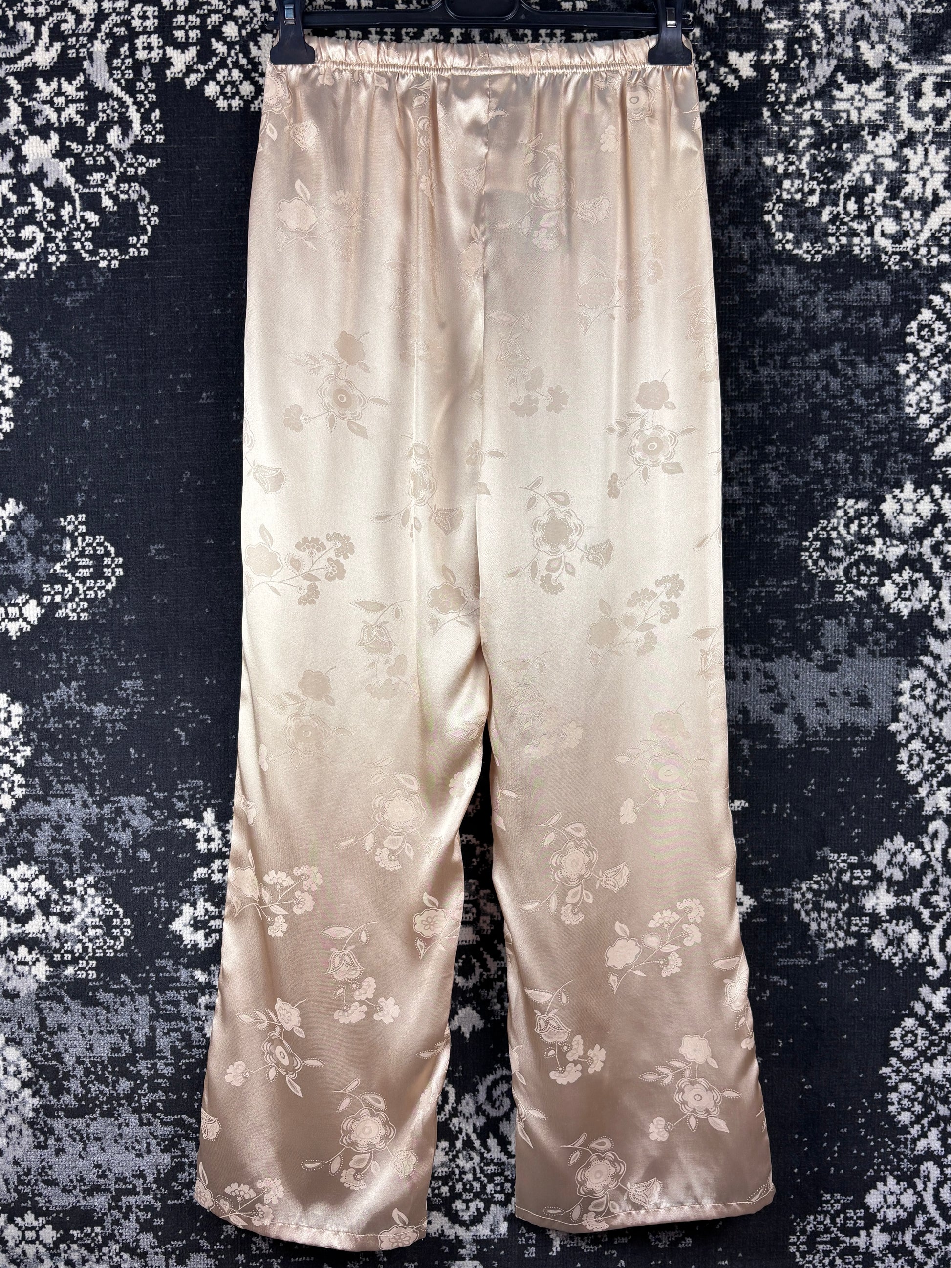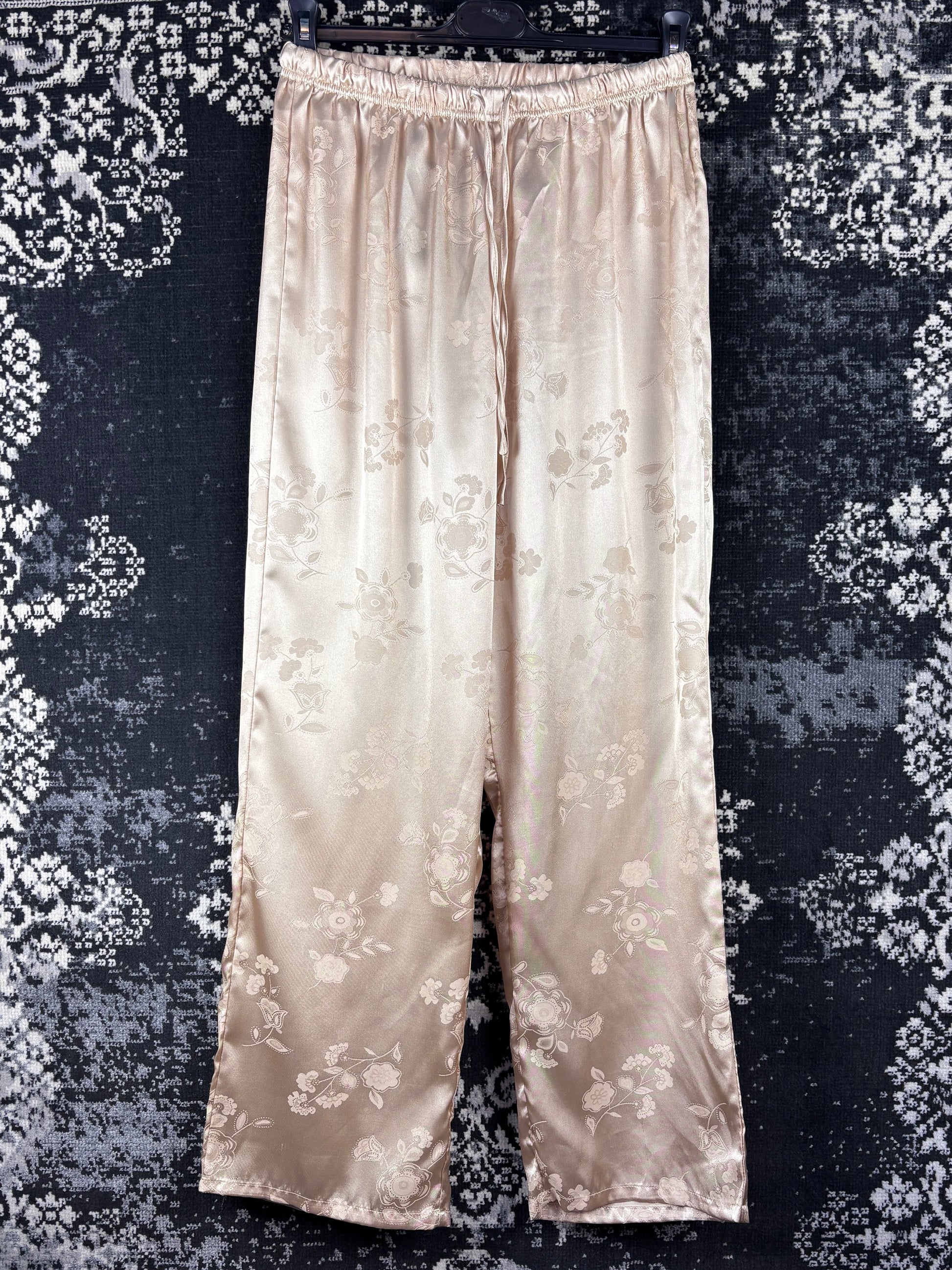 Womens Silky Beige Pajama Set - Floral Satin Two Piece Lounge Wear Button Up Top Wide Leg Pants Sleepwear Size L