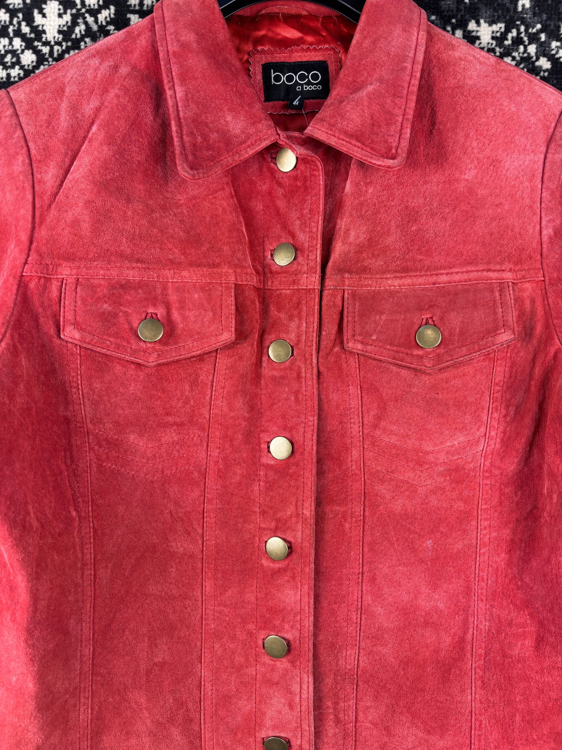 Womens Vintage Red Suede Jacket - Button Front Leather Coat 90s Classic Fitted Western Style Retro Outerwear Size M